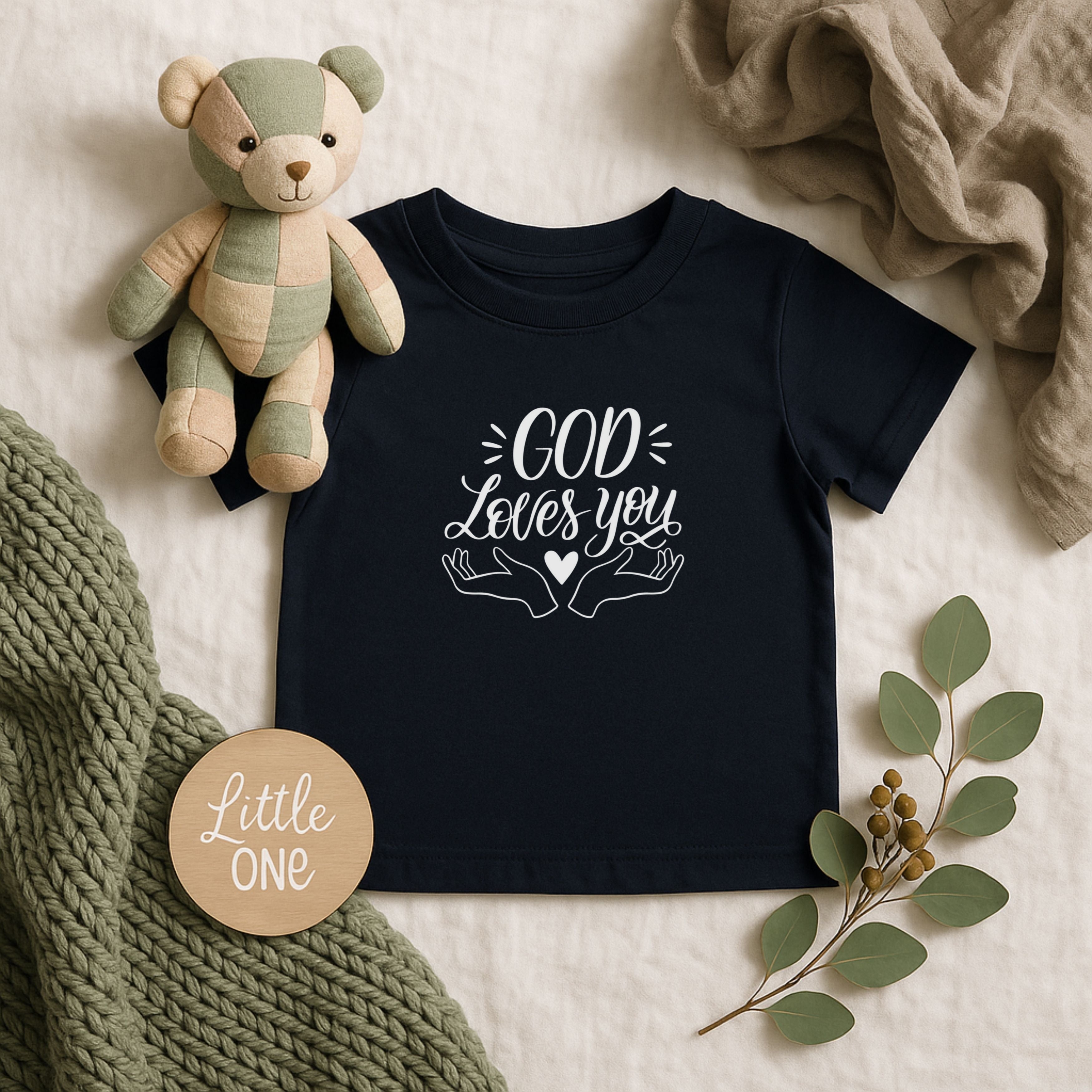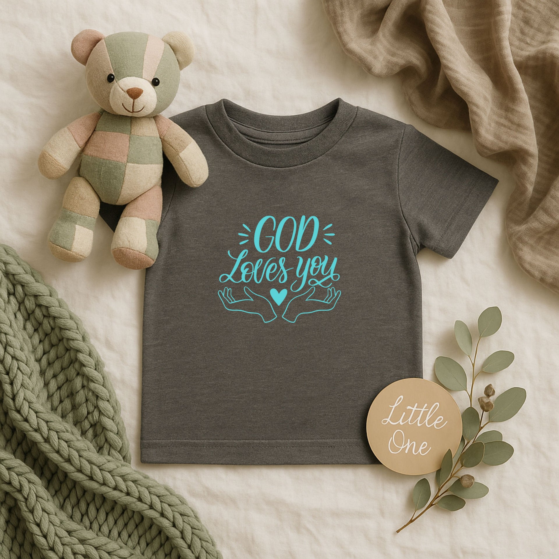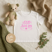A soft, lightweight infant tee made for tiny bodies and big embraces. This classic-fit jersey top feels gentle against delicate skin and carries a sweet, hand-lettered design in soft pink that reads “God Loves You,” framed by open hands and a small heart.