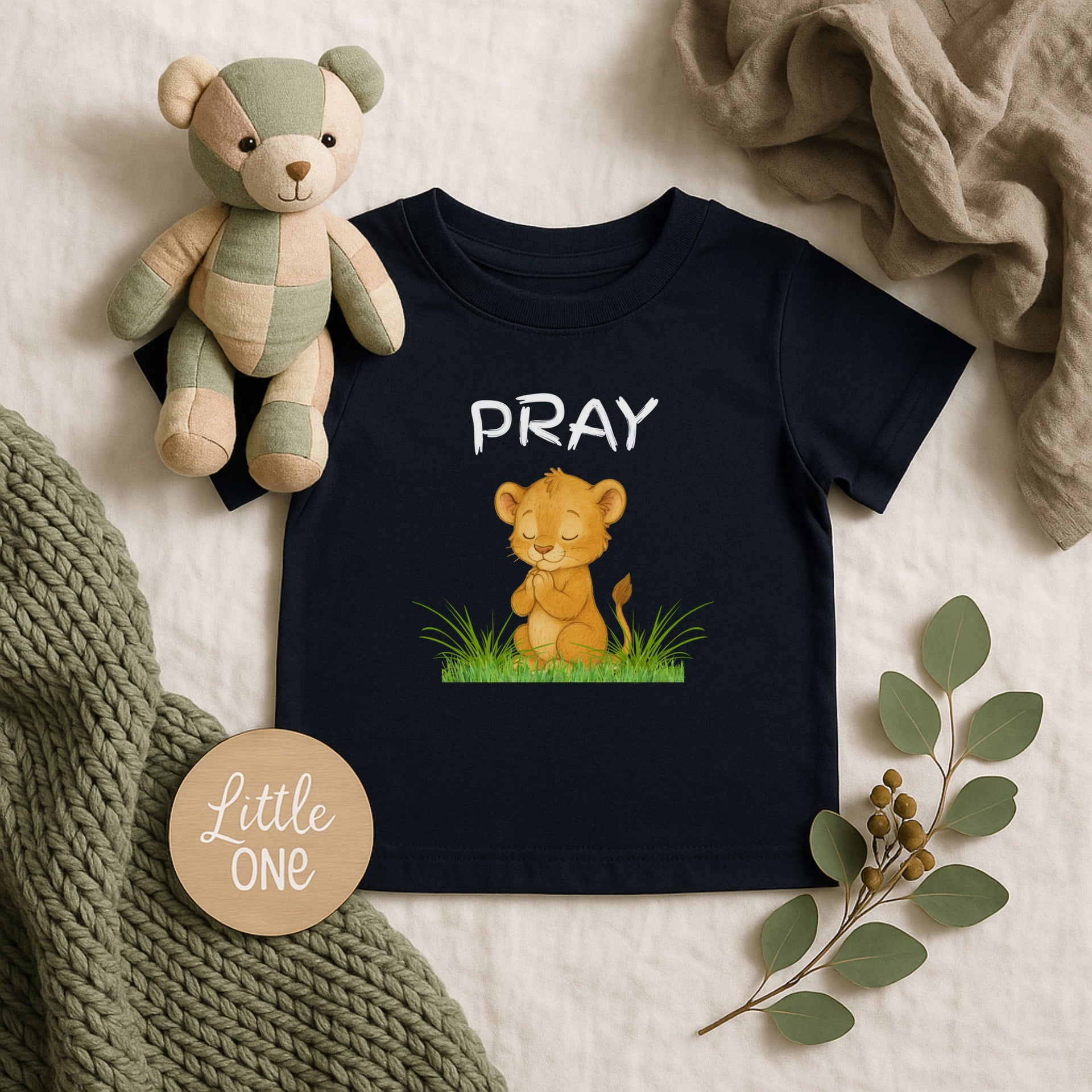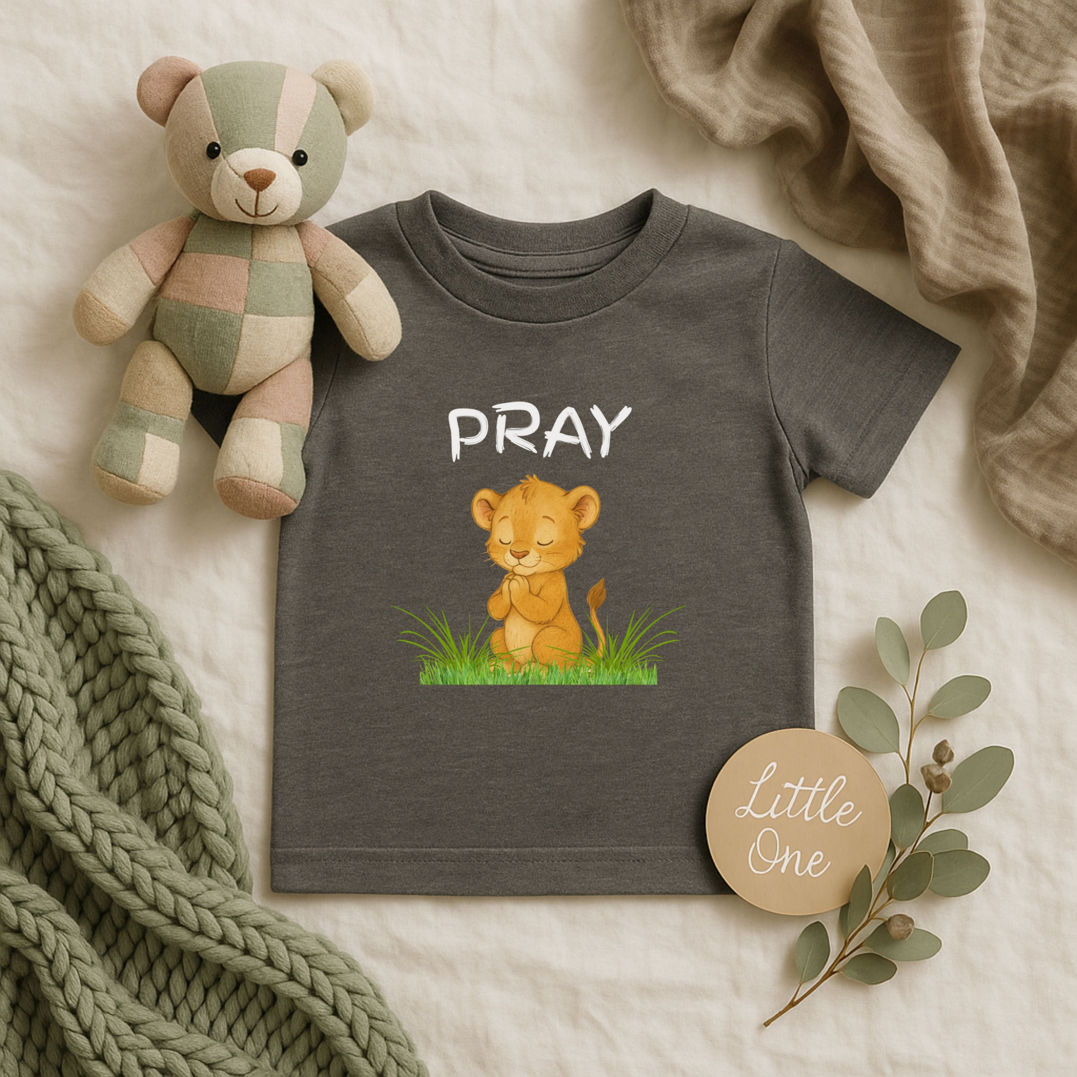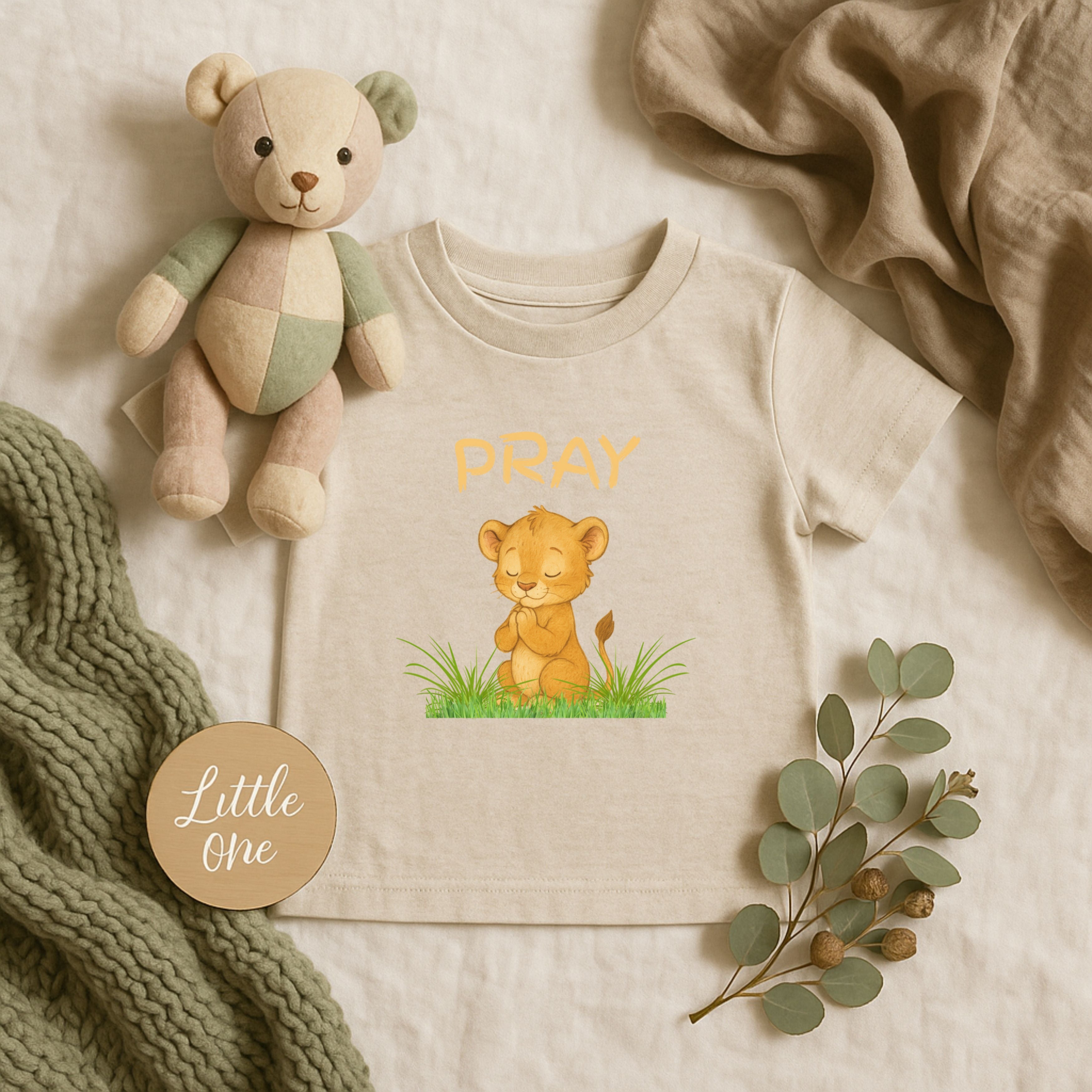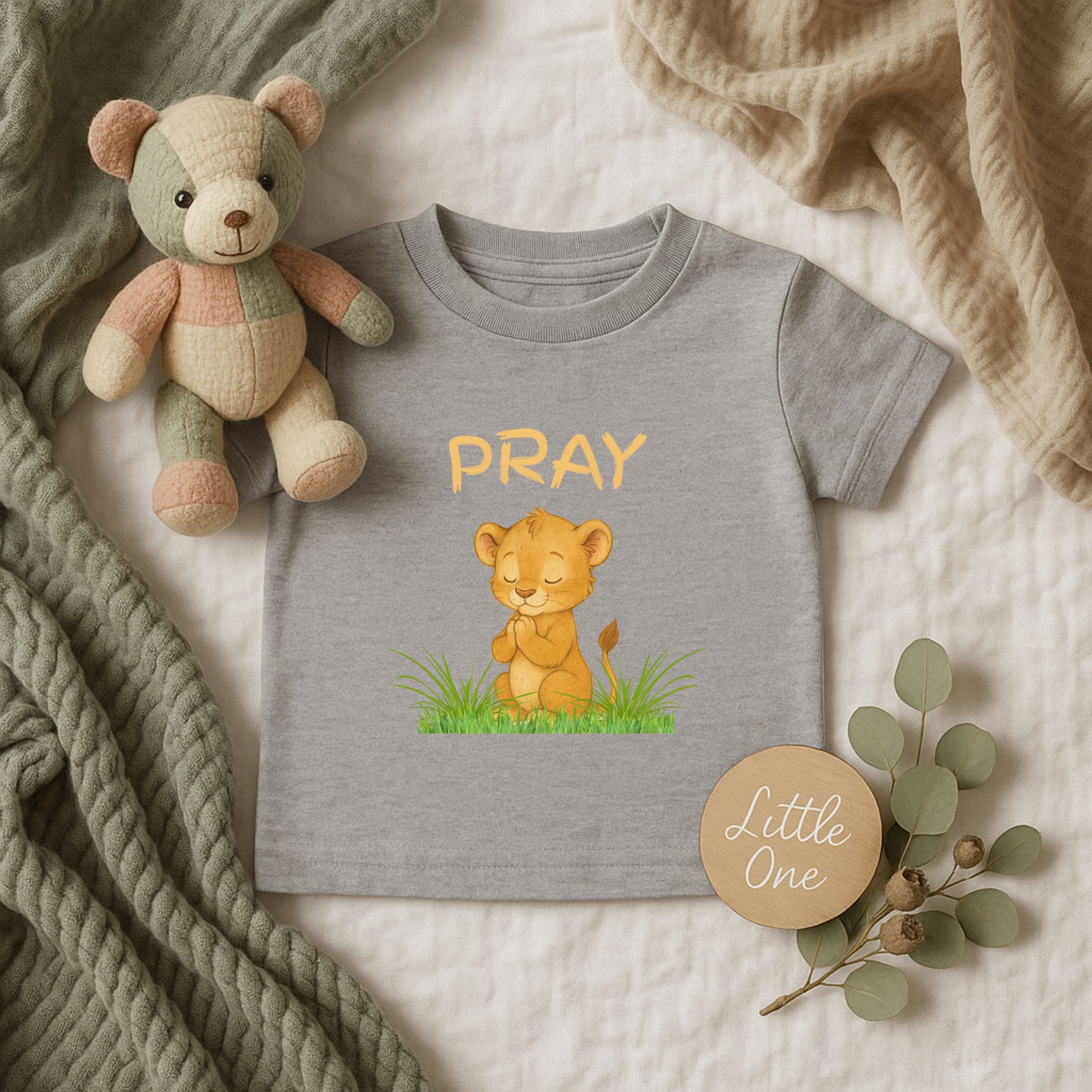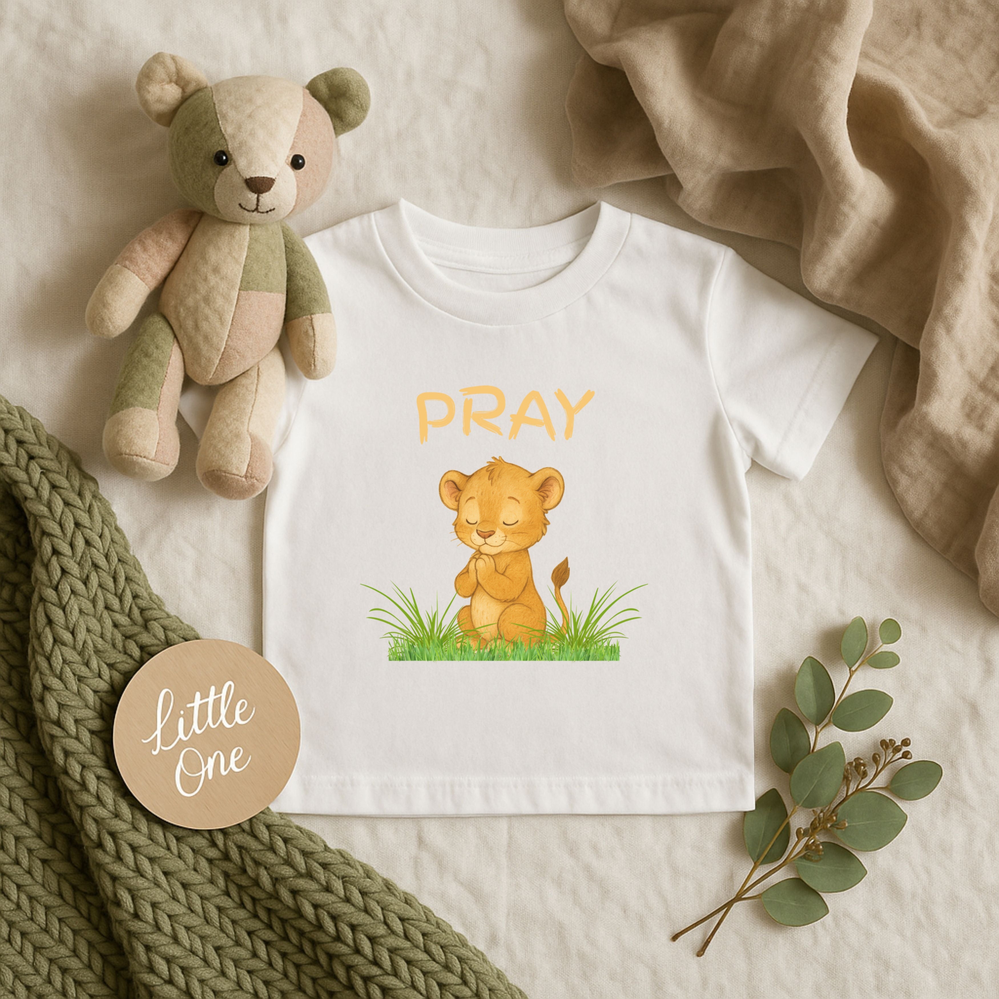 Soft, lightweight tee made for tiny bodies and big hearts. This classic-fit infant shirt features a gentle watercolor-style lion cub kneeling in the grass beneath the warm, hand-lettered word “PRAY.”