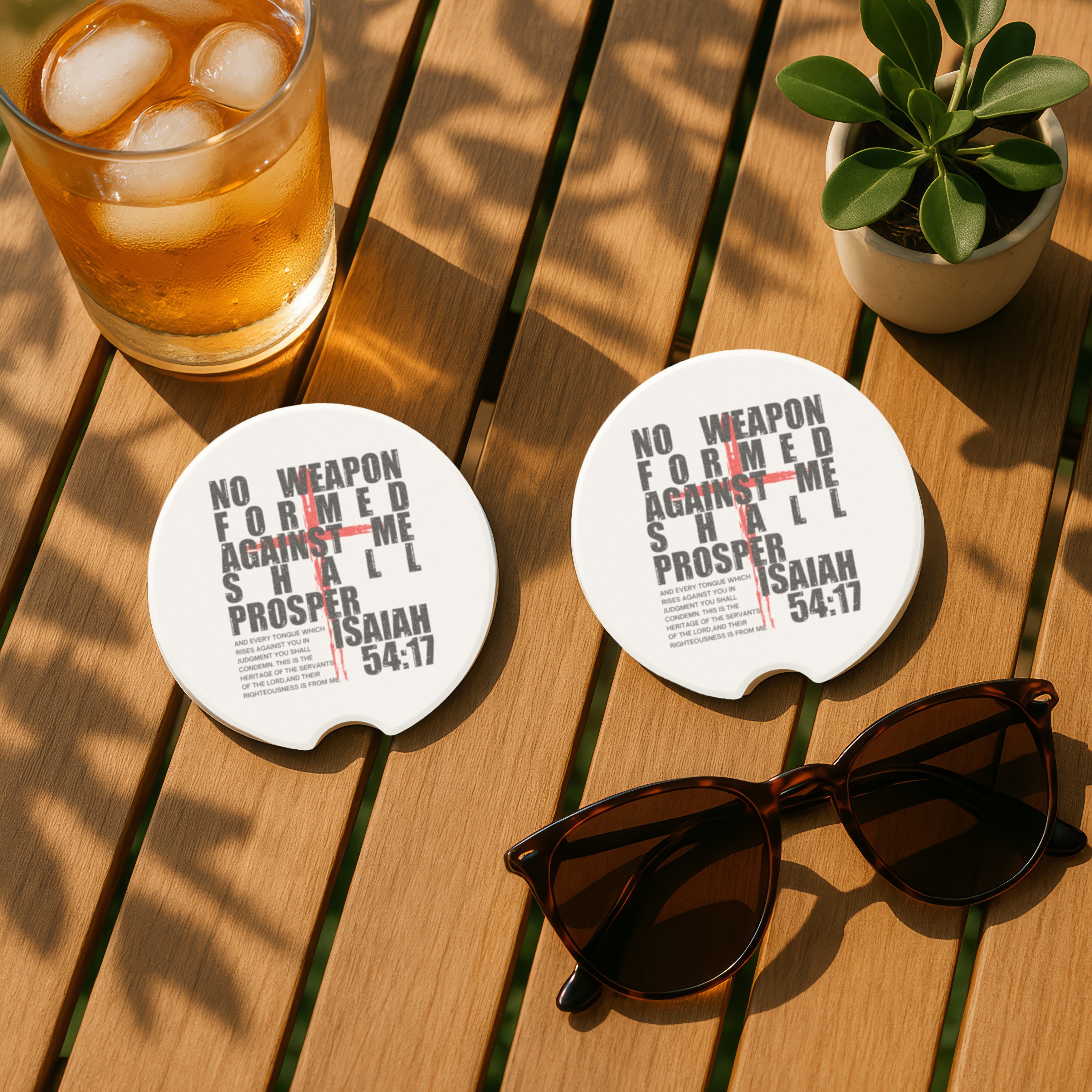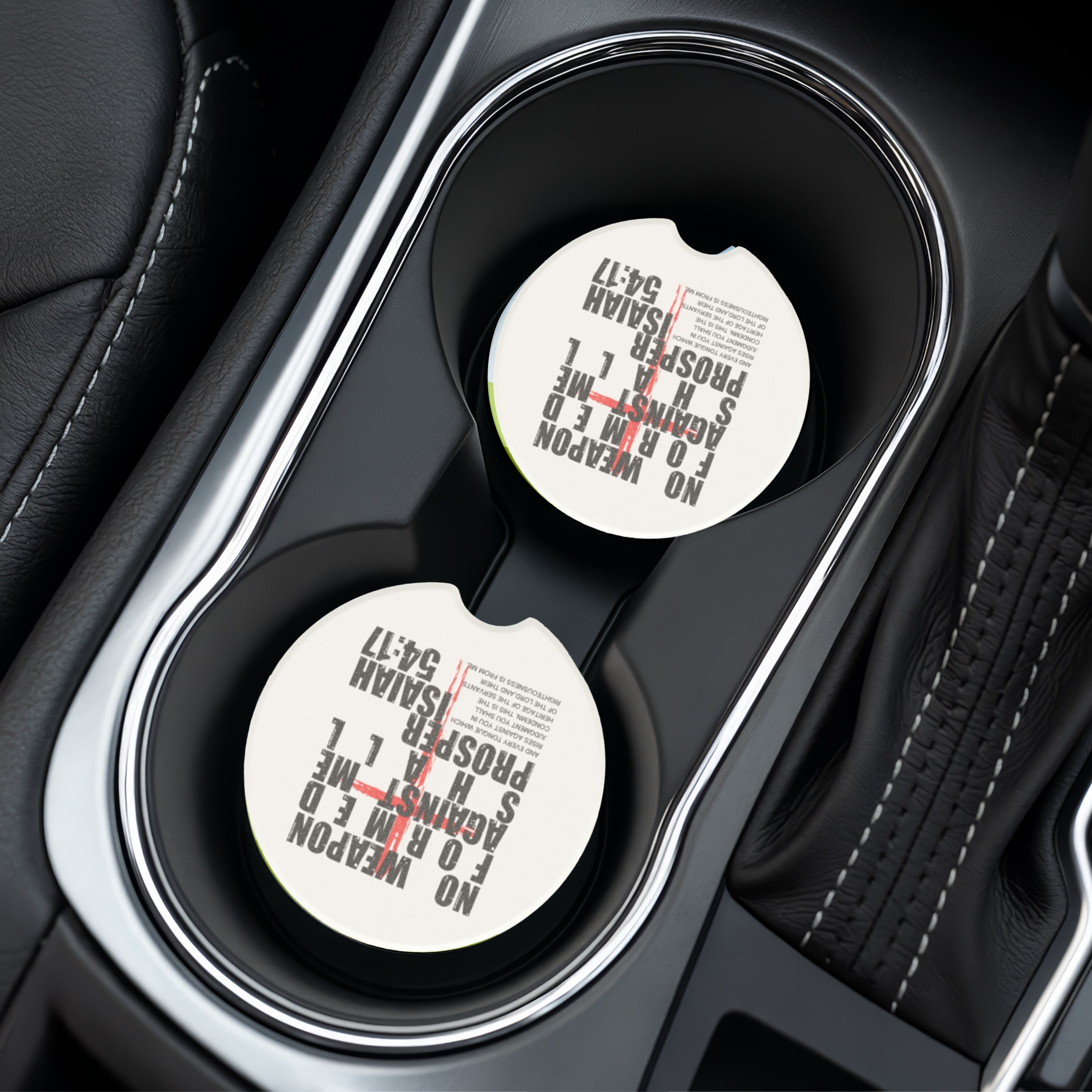 Made from durable soapstone, it naturally absorbs moisture to protect your cup holders from condensation and spills. The engraved “No Weapon Formed Against Me” design adds both function and inspiration, making your car interior more meaningful.