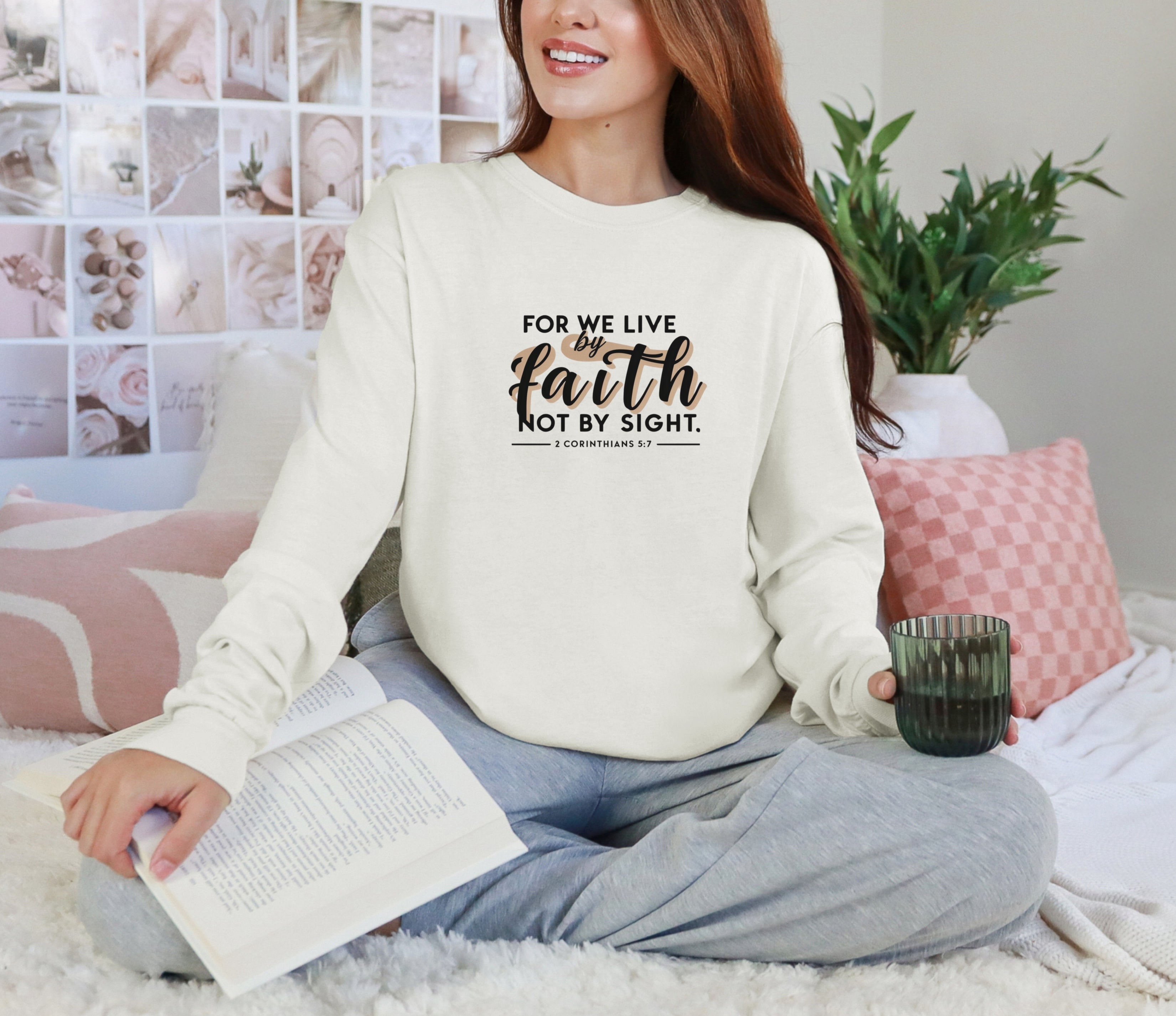 Declare your walk in Christ with our Live by Faith, Not by Sight long sleeve tee—boldly inspired by 2 Corinthians 5:7. This unisex shirt combines scripture-driven design with everyday comfort, making it the perfect wardrobe staple for believers who lead with trust, not what they see.