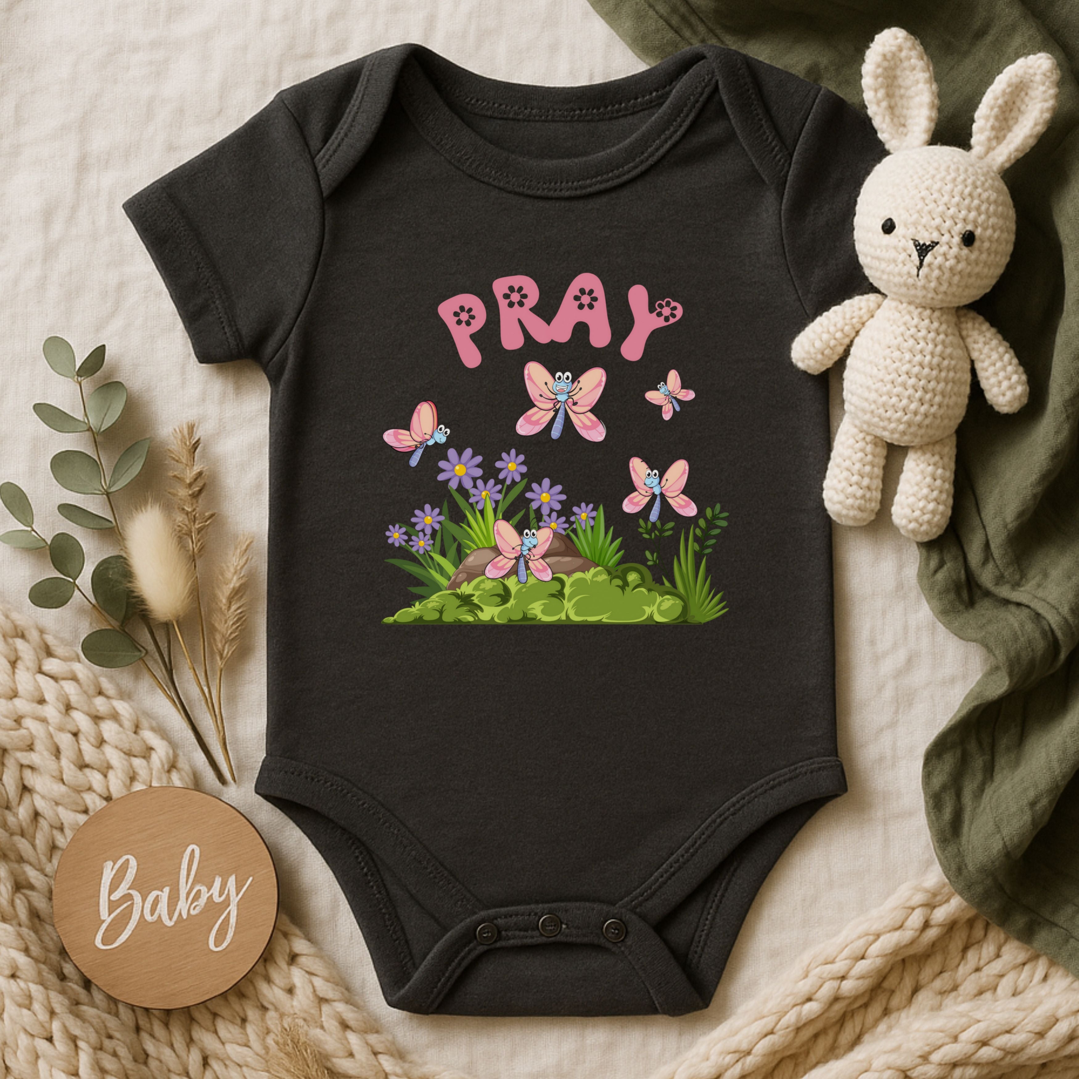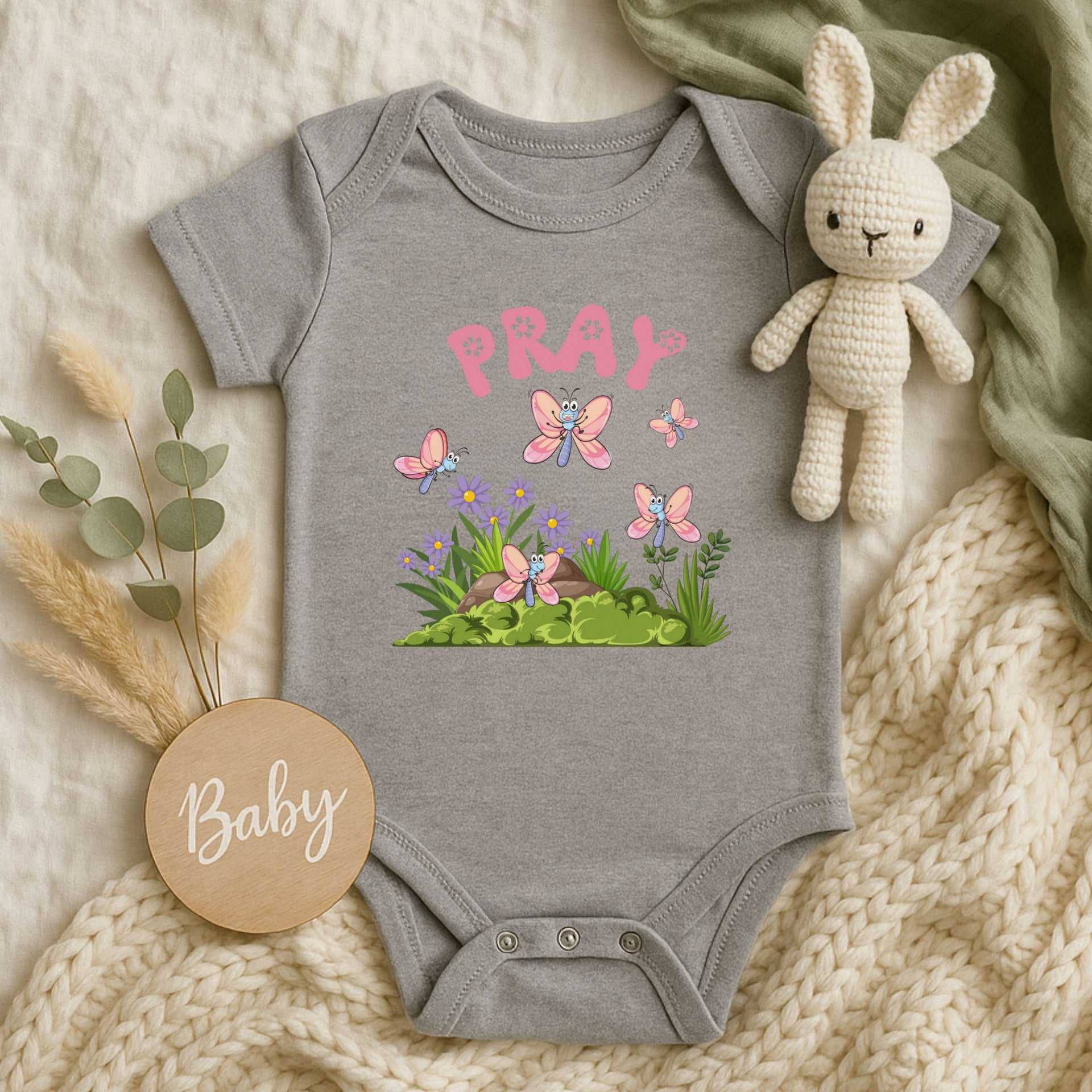 Keep your little one wrapped in faith with the “Pray” Infant Onesie.