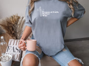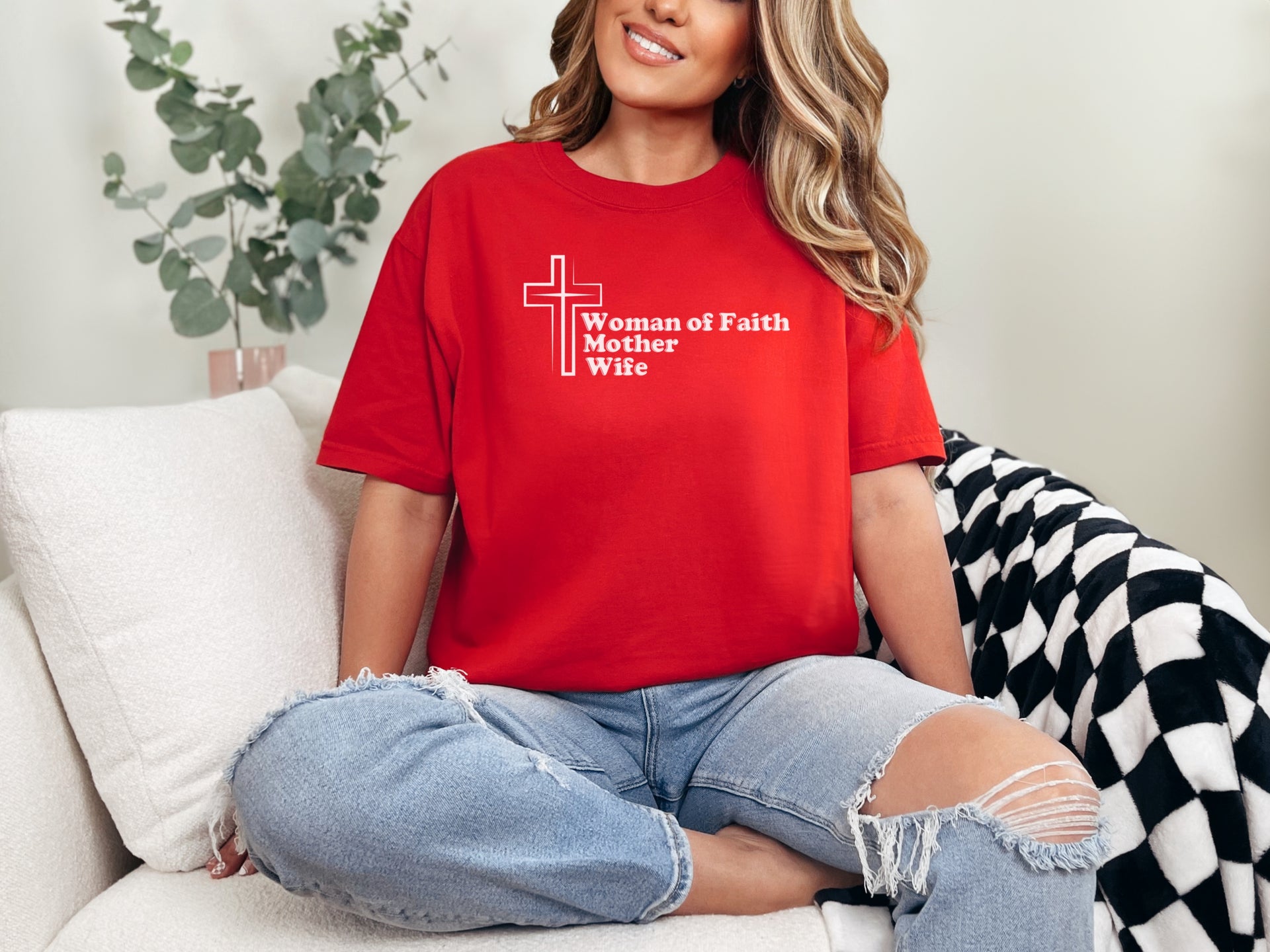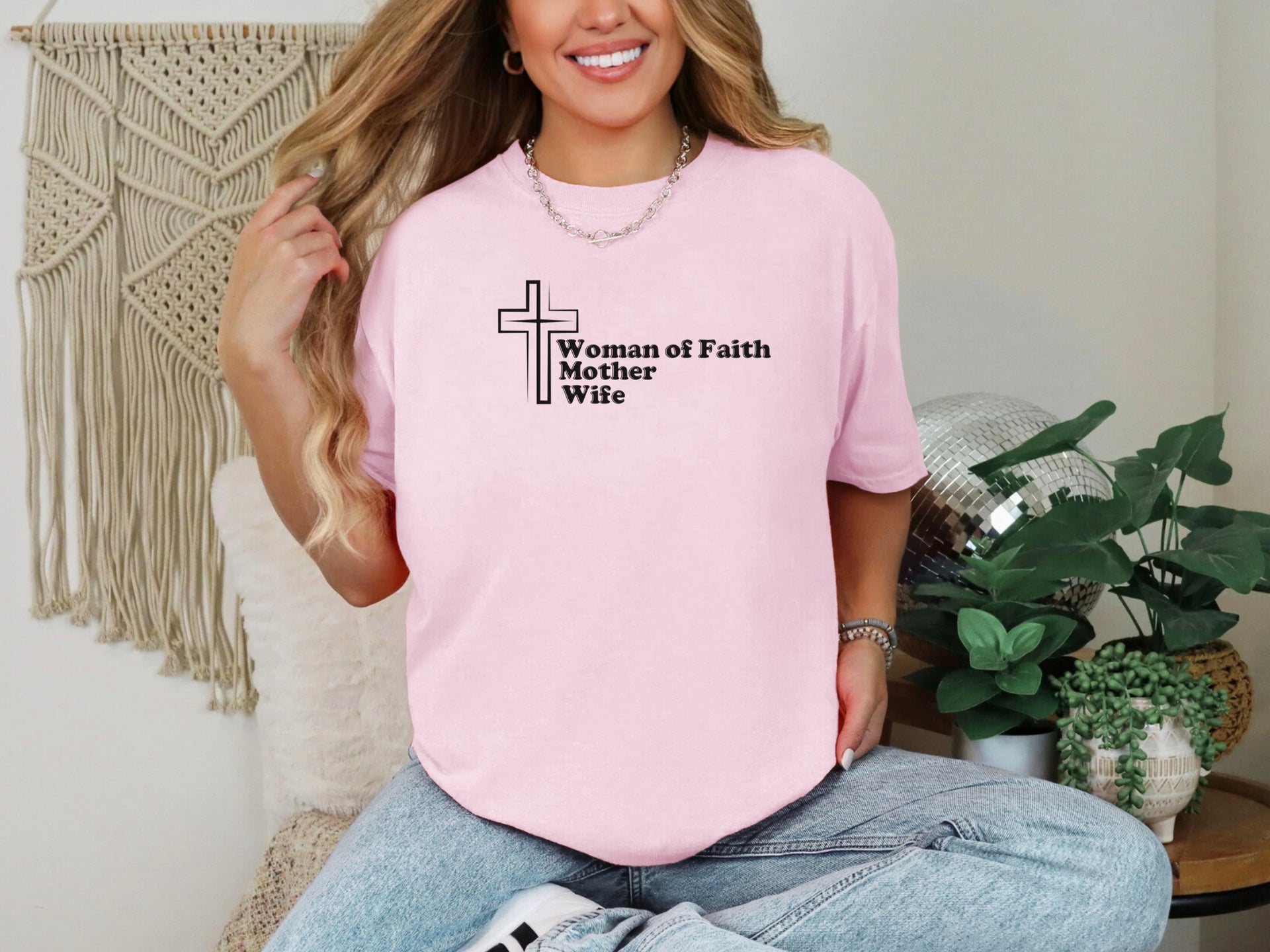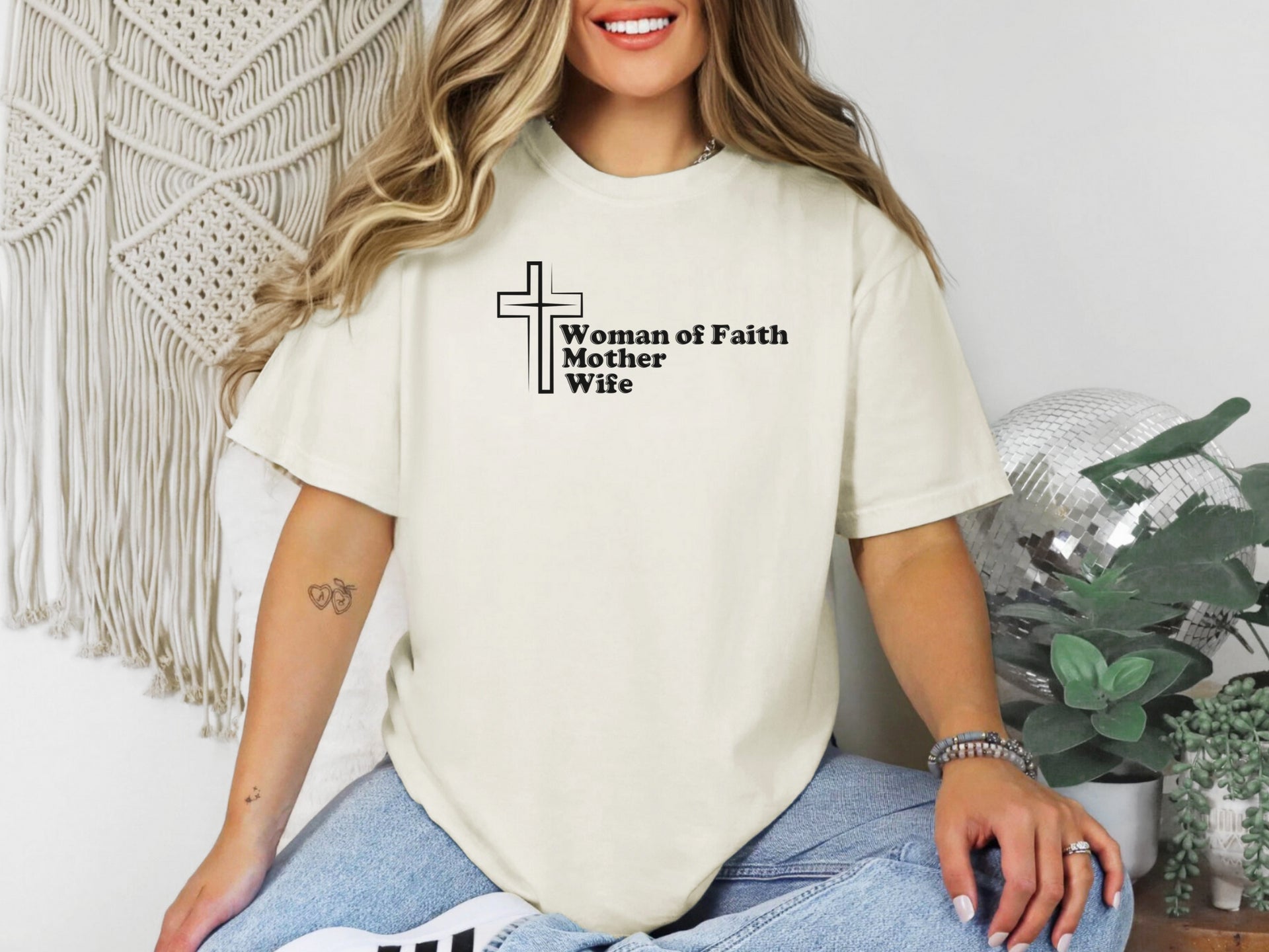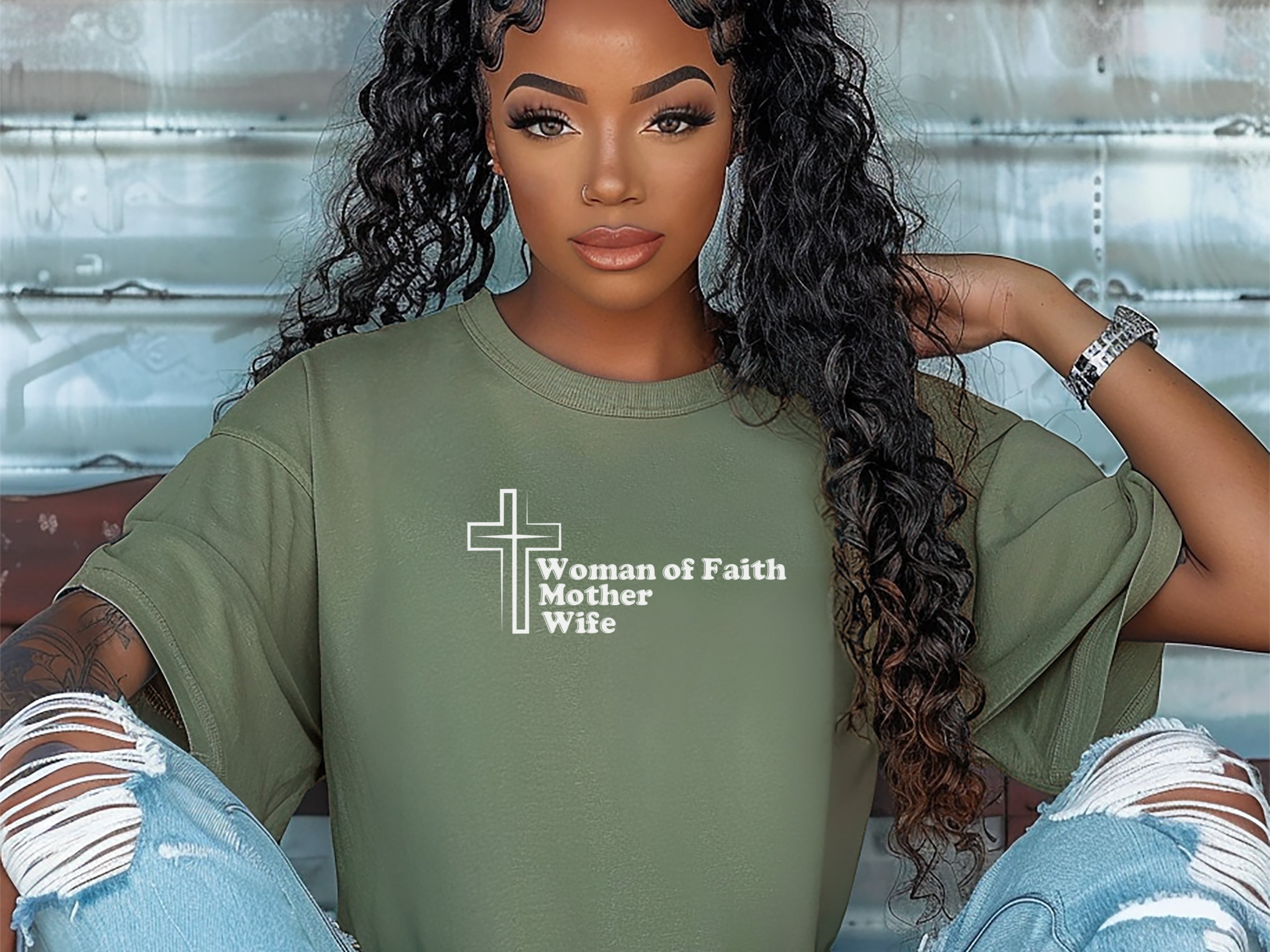 Celebrate your identity and calling with this beautifully designed “Woman of Faith, Mother, Wife” t-shirt.