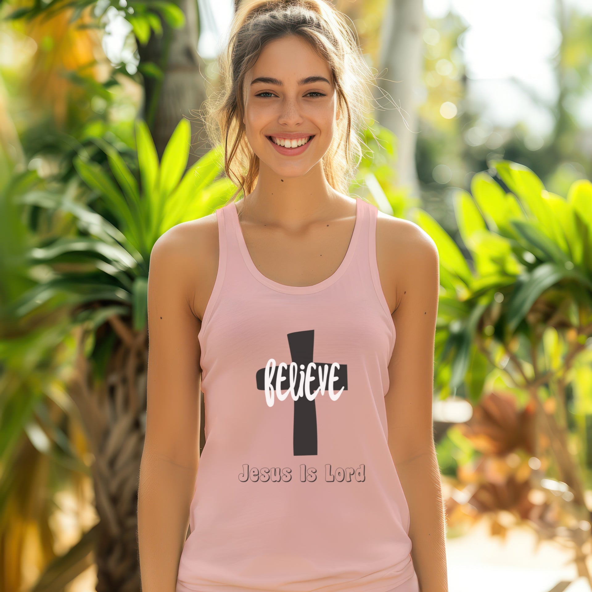 Believe Jesus Is Lord Flowy Racerback Tank Top