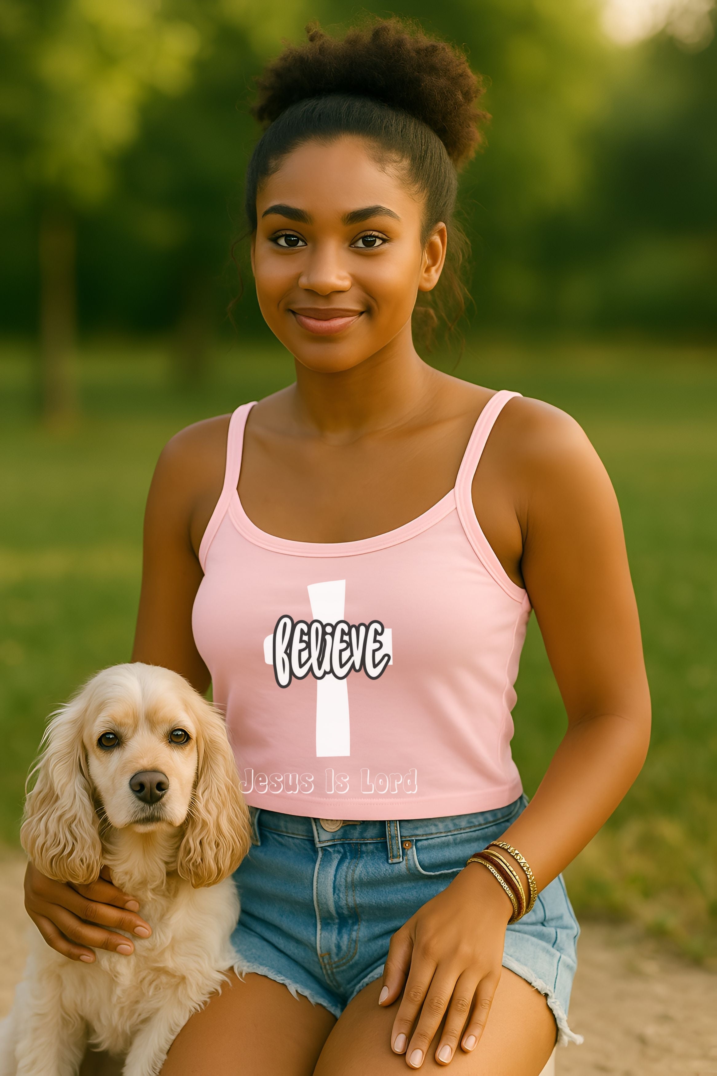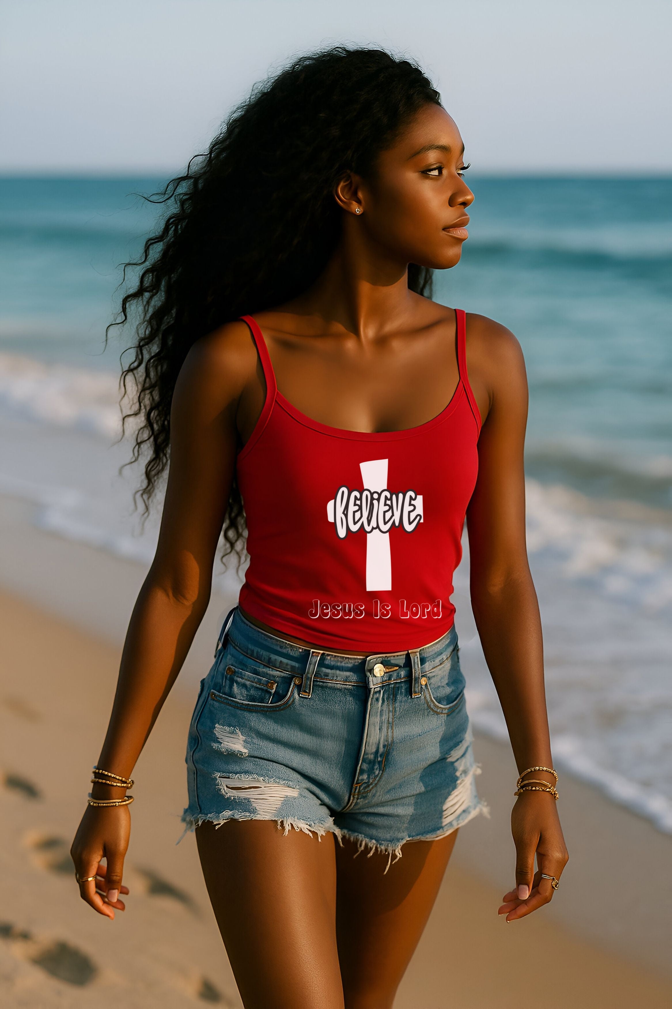 This tank top with the 'Believe Jesus Is Lord' design offers a comfortable and stylish option for women who want to showcase their faith. The soft fabric and thick spaghetti straps make it perfect for layering or wearing on its own during various activities. It is relevant for Christian women looking for a meaningful and fashionable piece of clothing to wear on religious holidays and gatherings.