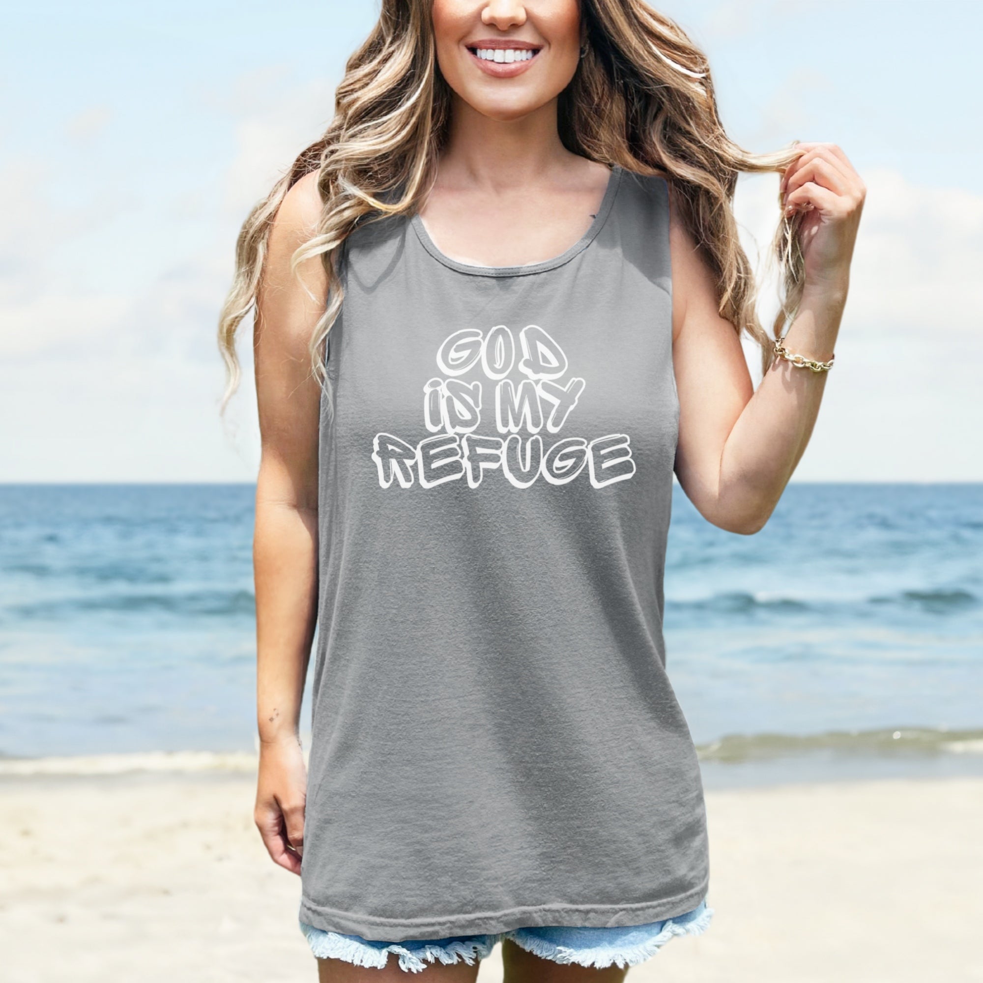 The God Is My Refuge Unisex Relaxed Fit Tank Top is a powerful reminder of the promise found in Psalm 46:1: “God is our refuge and strength, an ever-present help in trouble.” This truth offers comfort, courage, and hope no matter what life brings.
