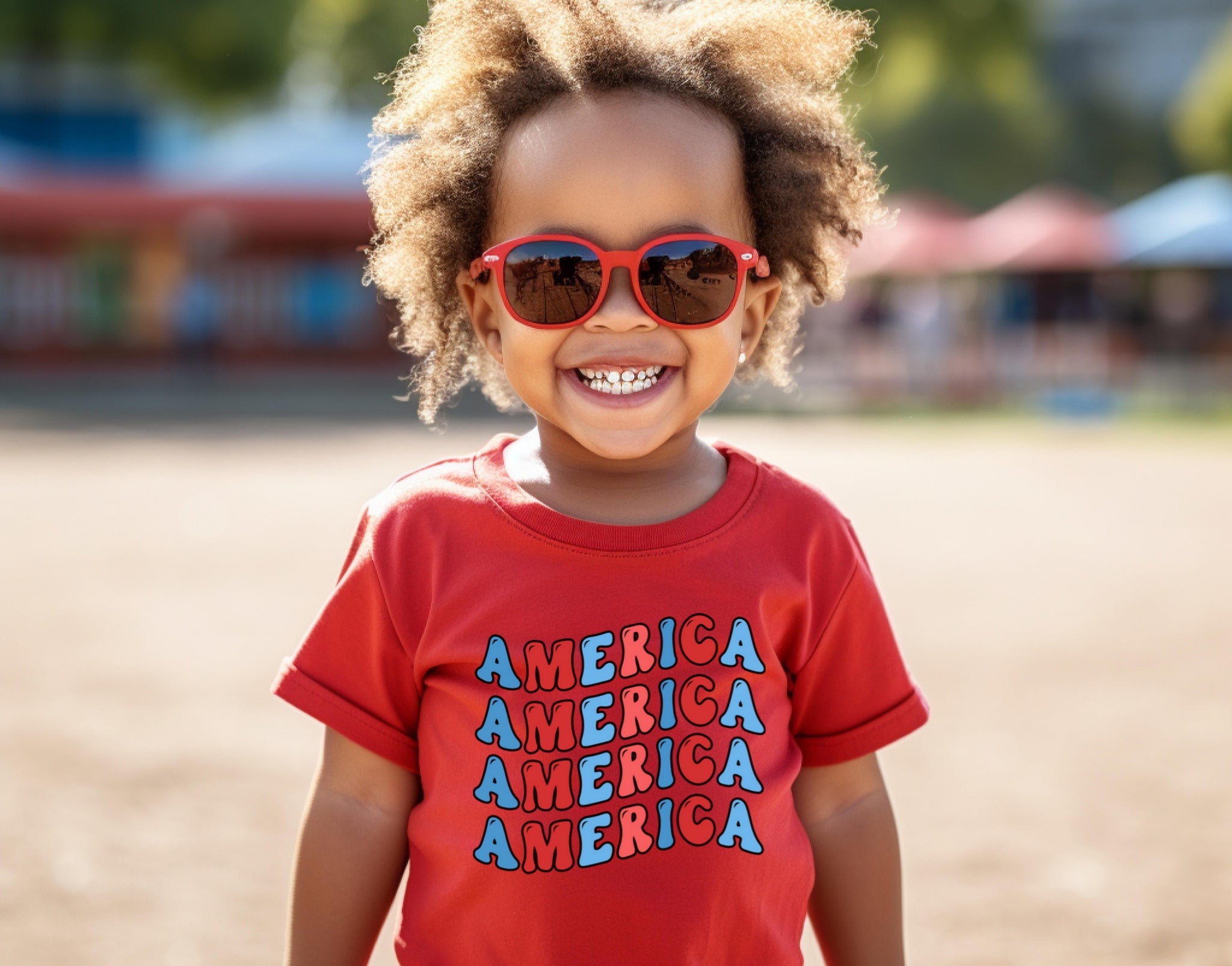Dress your little one in patriotic style with our America Patriotic Toddler T-Shirt. Designed with a fun red, white, and blue theme, this tee is perfect for celebrating Independence Day, Memorial Day, Labor Day, or any day your toddler wants to show off their love for the USA.