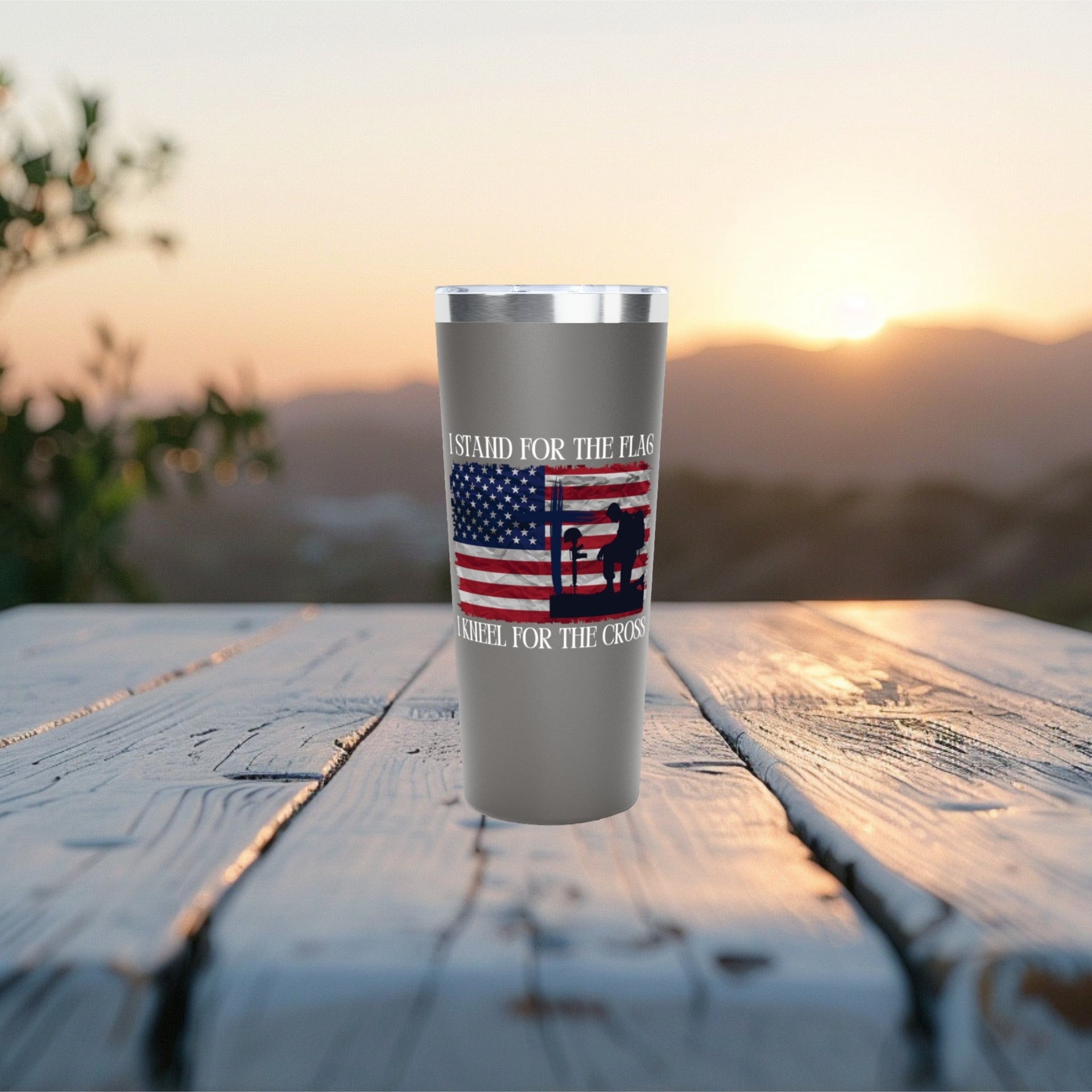 Message: “I Stand For The Flag, I Kneel For The Cross” 22oz stainless steel tumbler with copper vacuum insulation