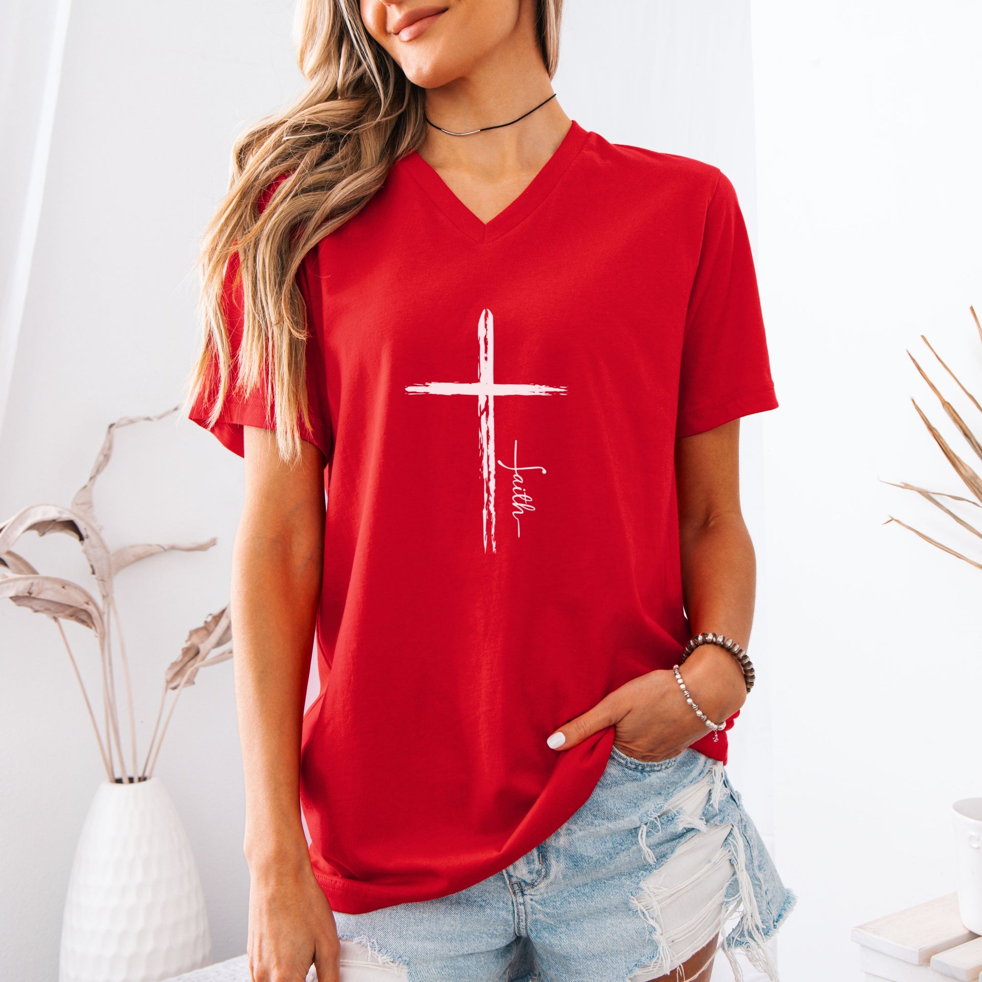 The Cross With Faith Unisex V-Neck T-Shirt is more than just apparel — it’s a powerful statement of belief. Featuring a clean and striking cross design paired with the word “FAITH,” this shirt inspires confidence in Christ and sparks conversations wherever you go.