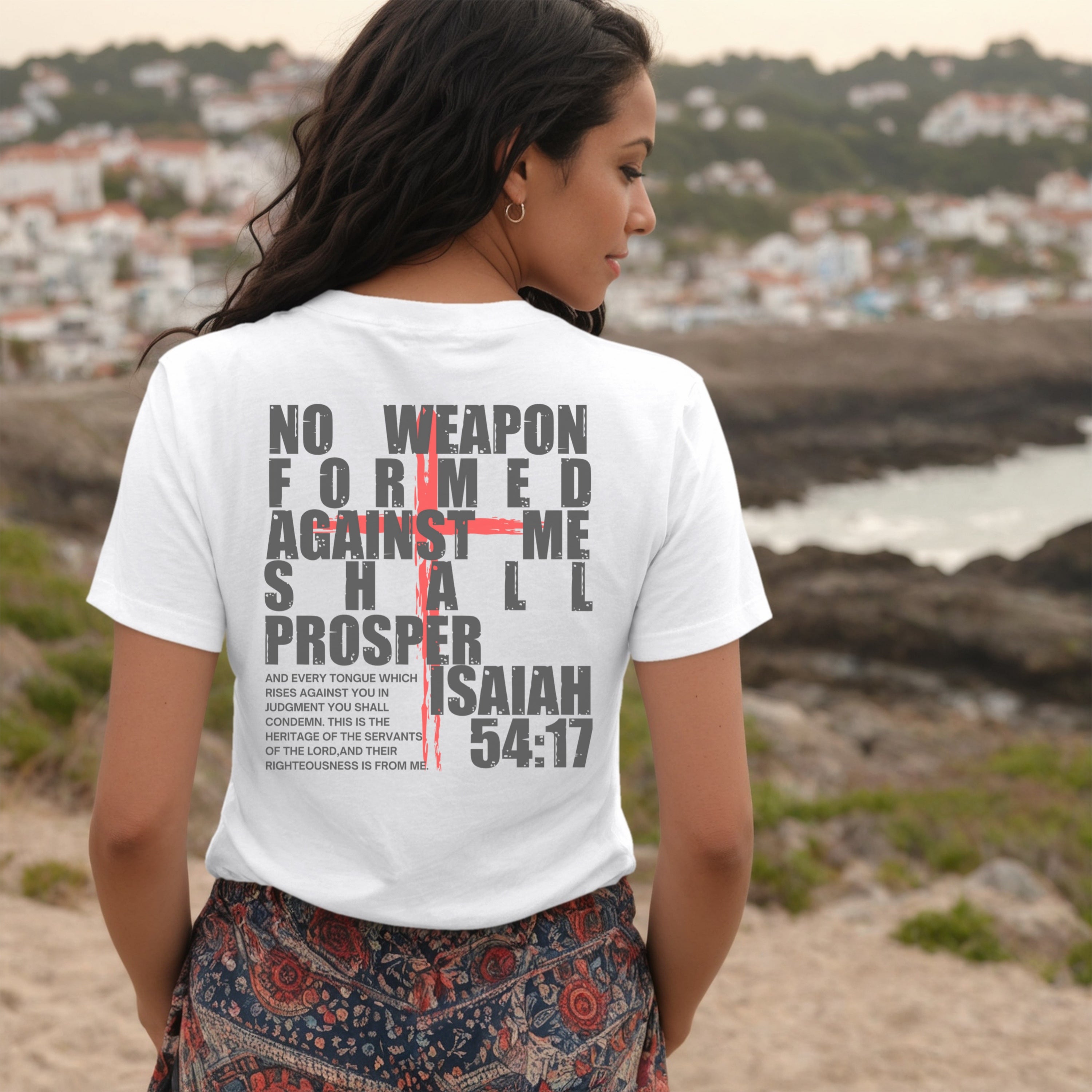 Declare your spiritual confidence with our bold “No Weapon Formed Shall Prosper” T-Shirt, inspired by Isaiah 54:17. This powerful verse is a shield of truth, reminding believers that no attack, no fear, no challenge can prevail against what God protects.
