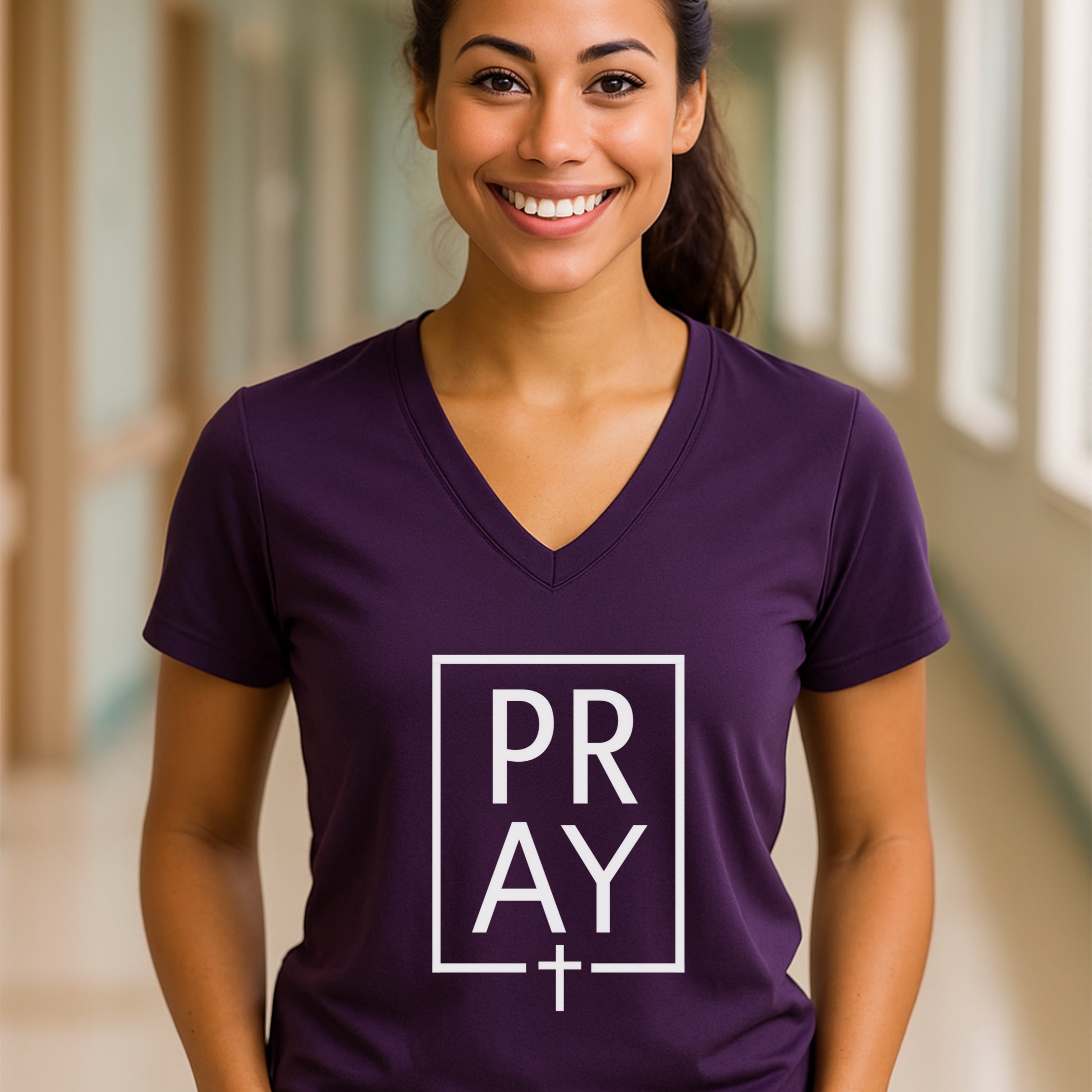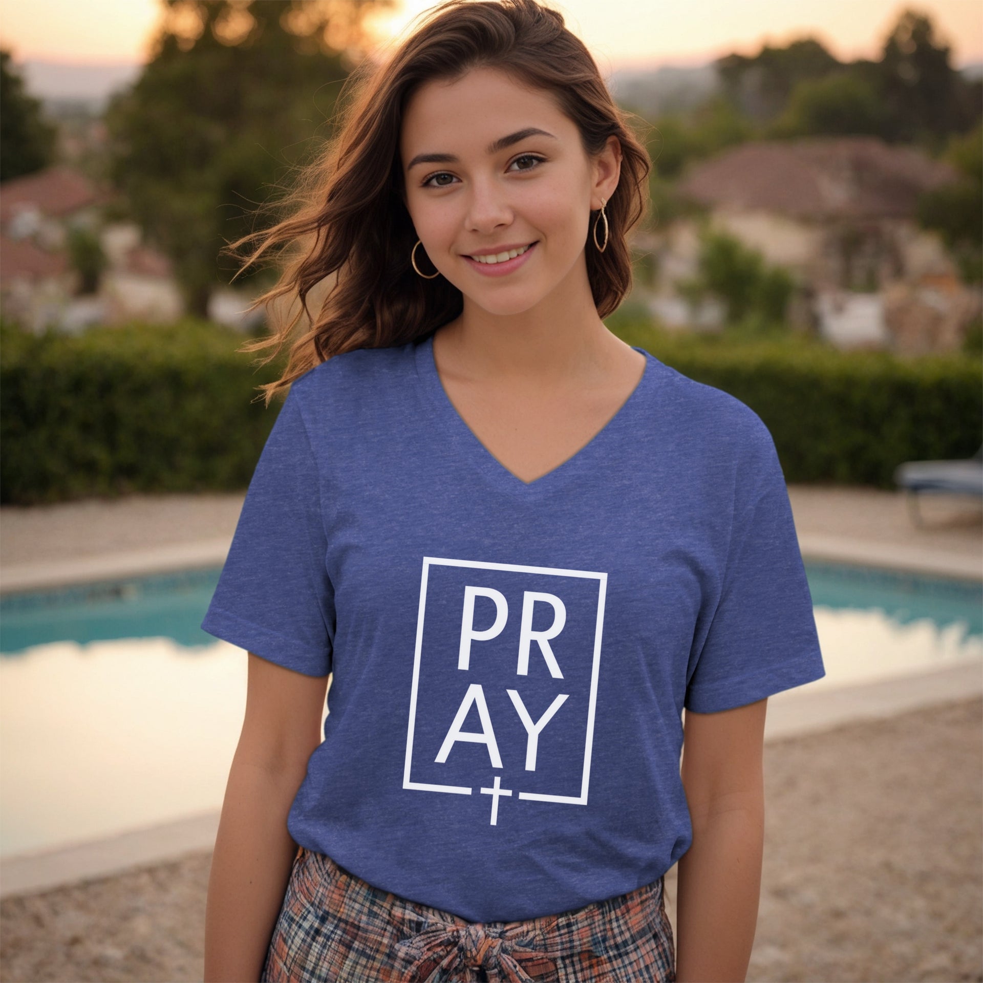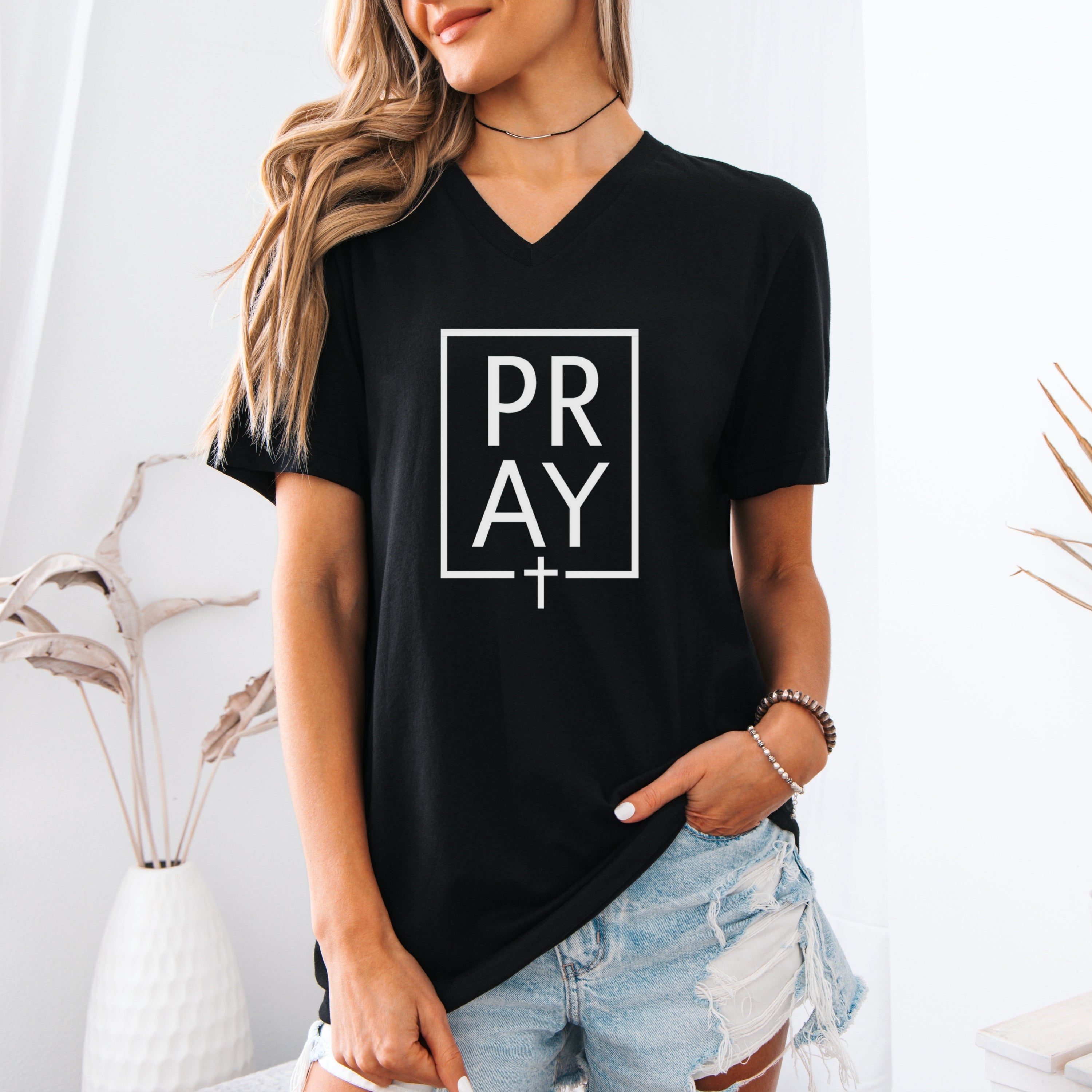 The Pray + Cross Unisex V-Neck T-Shirt is a minimalist statement of what matters most — prayer and the power of the cross. With a clean, modern design that features the word “PRAY” alongside a subtle cross symbol, this tee invites quiet strength and faithful living into every space you enter.
