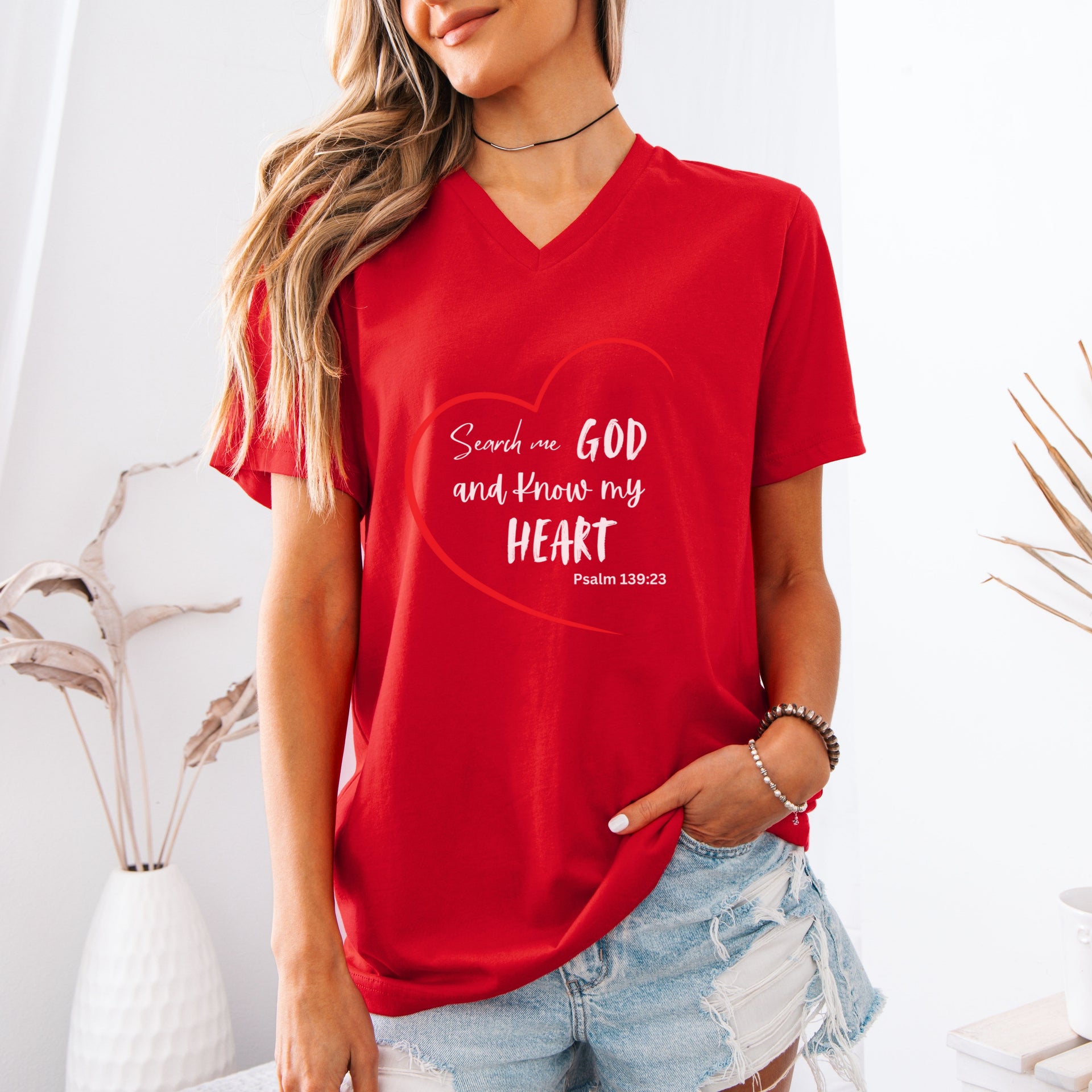 The Search Me God Unisex V-Neck T-Shirt features a powerful message inspired by Psalm 139:23 — “Search me, God, and know my heart.” This simple yet impactful design invites reflection, surrender, and authenticity in your walk with Christ.