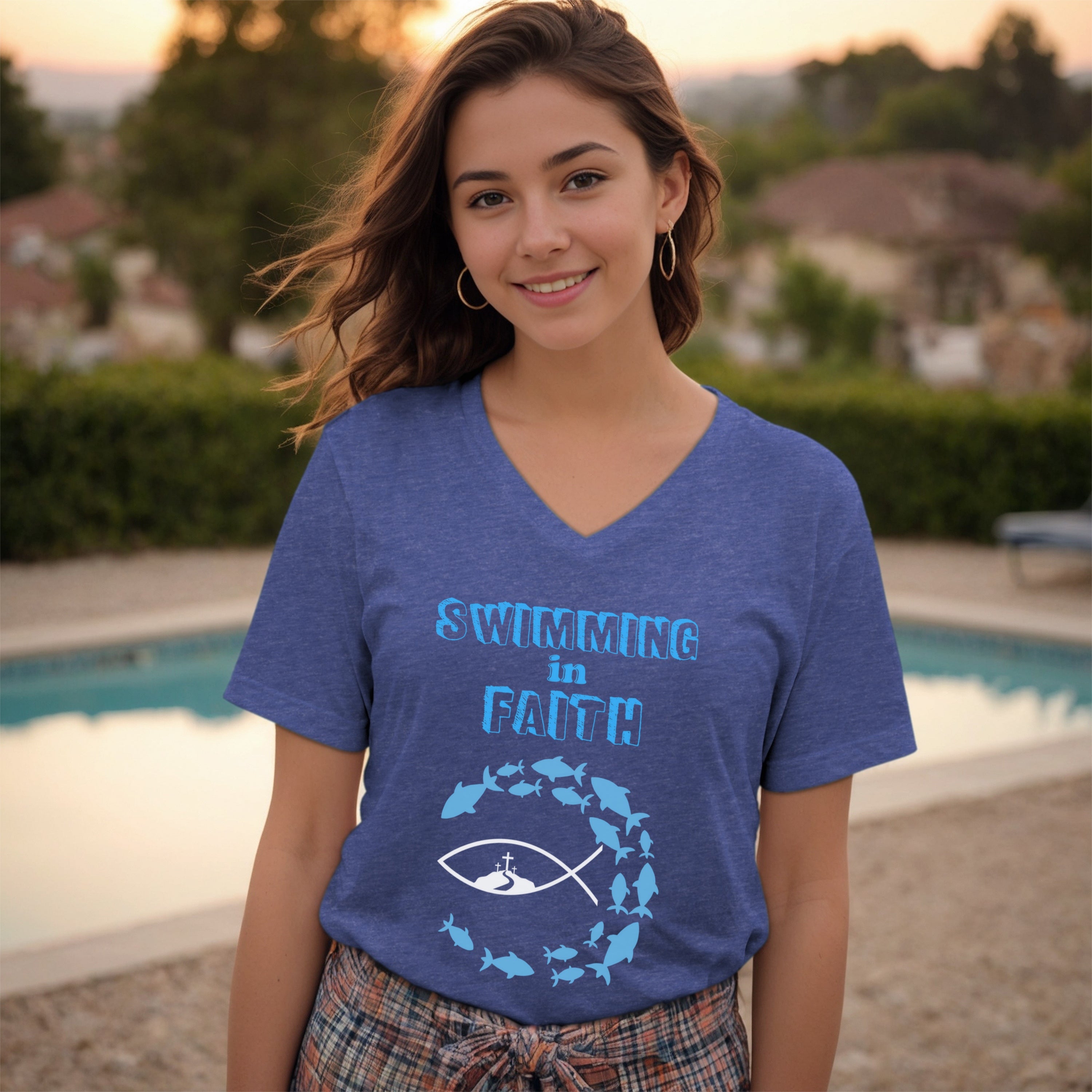 This Swimming In Faith Unisex V-Neck T-Shirt provides a comfortable and stylish option for adults looking to express their faith in a trendy way. The lightweight fabric and retail fit make it suitable for any season and setting. Perfect for those who want to incorporate their faith into their everyday wardrobe, this shirt is ideal for religious holidays and events.