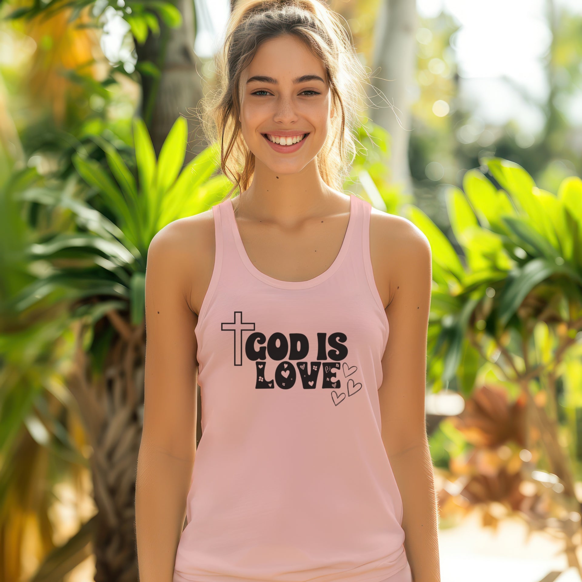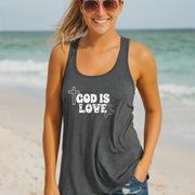 Stay cool and comfortable in this God is Love Womens Flowy Racerback Tank Top. Perfect for casual wear or as part of a workout outfit. Ideal for women who want to express their faith in a stylish way. Relevant for religious gatherings, summer outings, and everyday wear.