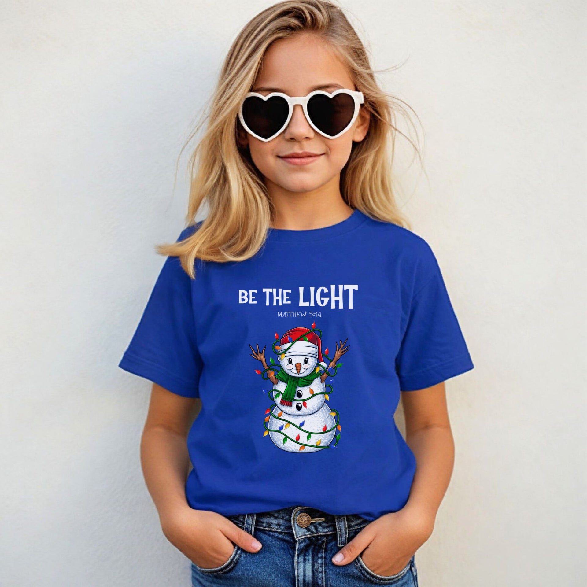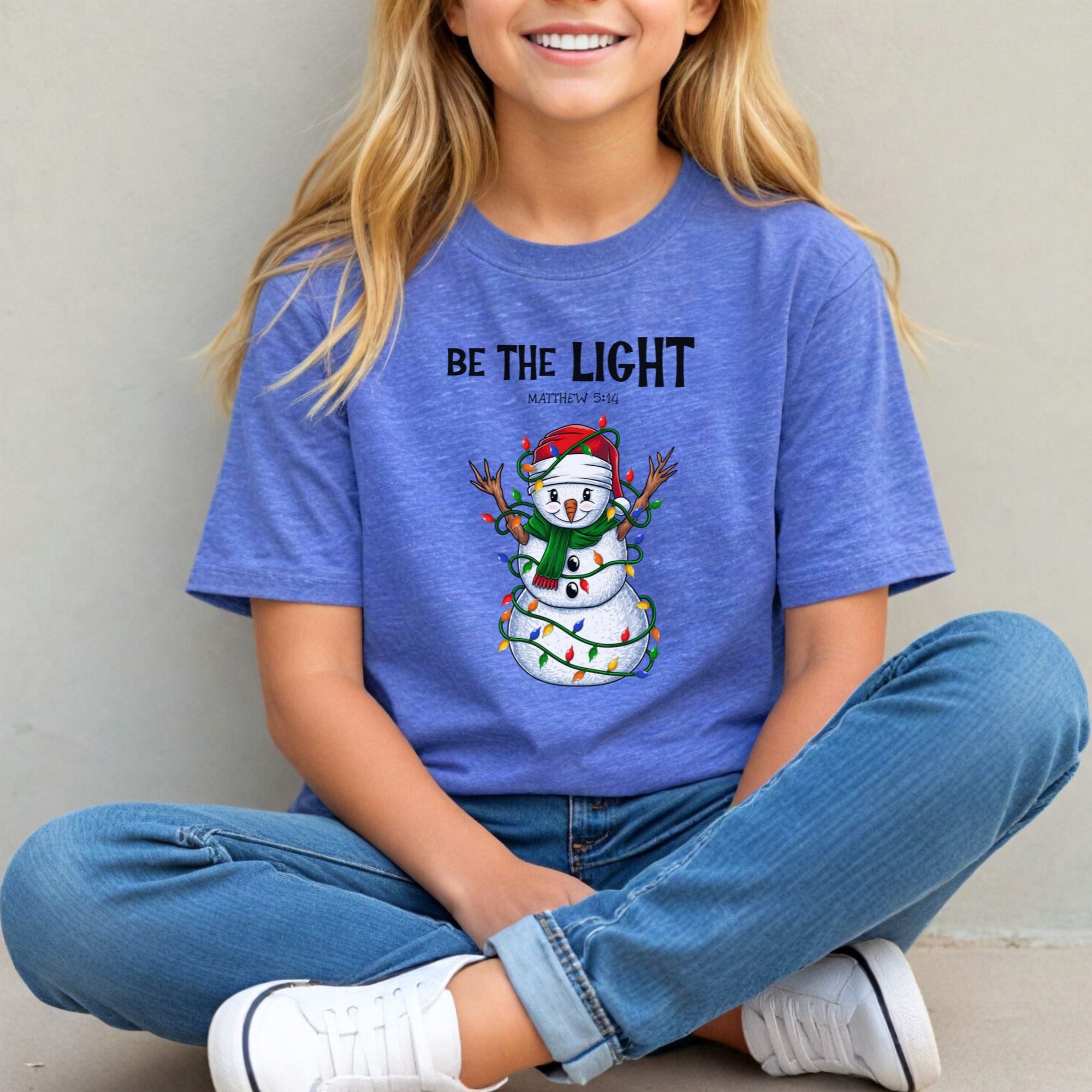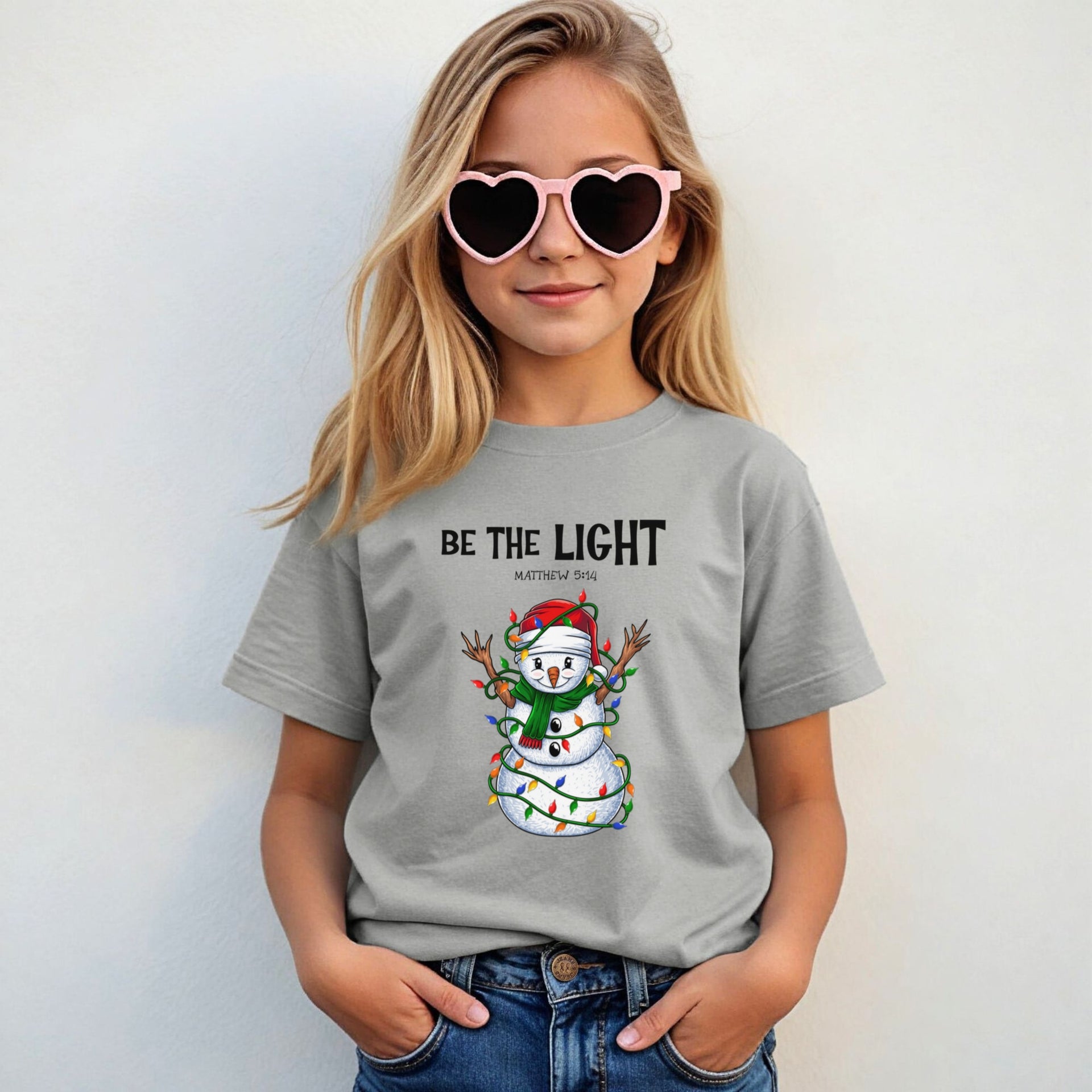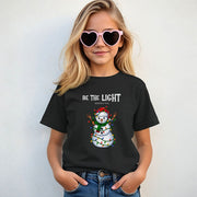 Soft, cheerful, and quietly festive — this "Be the Light" youth short sleeve tee brings a tender winter moment to everyday play. A sweet snowman wrapped in twinkling lights sits center chest, like a small lantern guiding snowy adventures and cozy evenings.