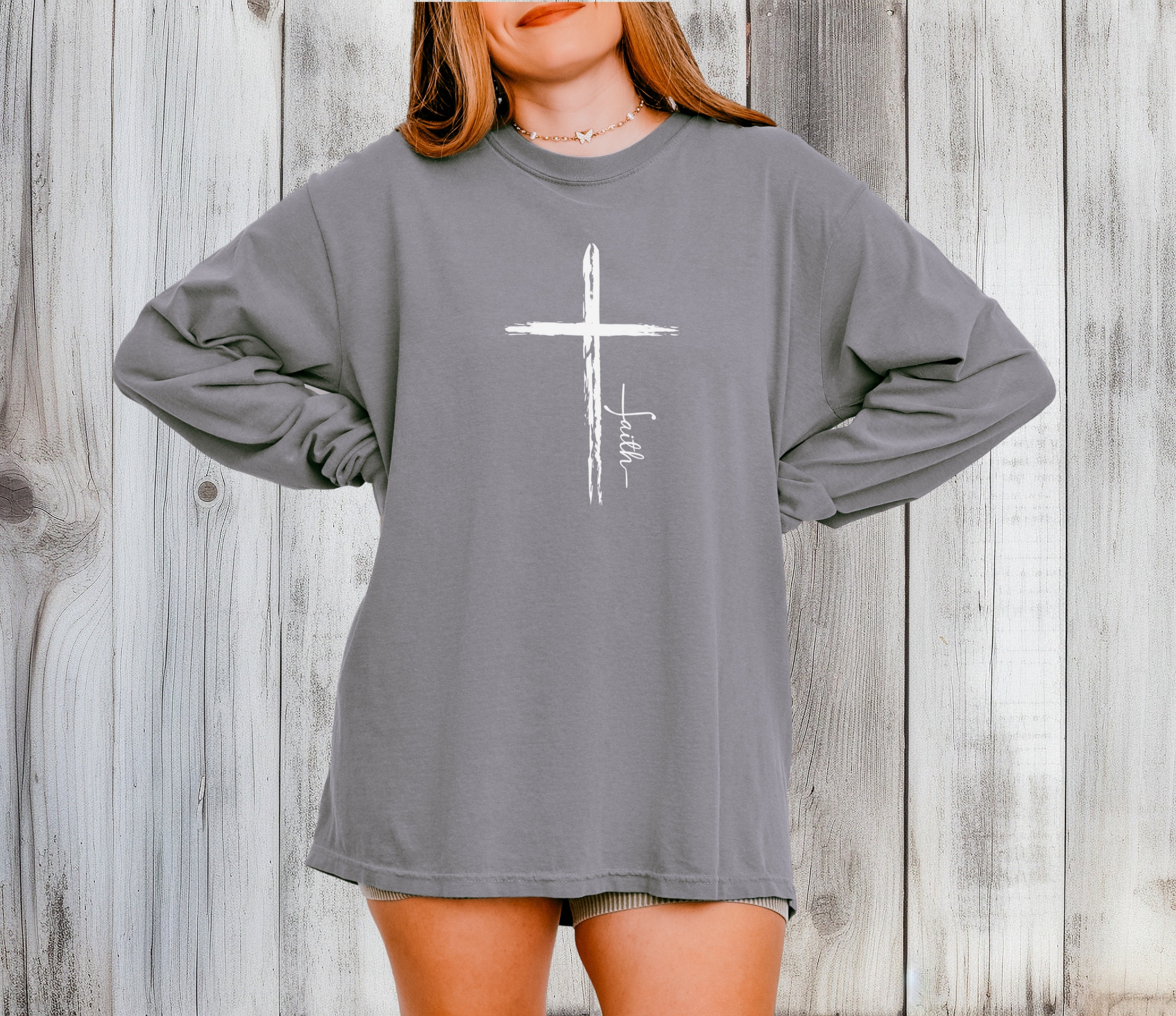 The “Cross With Faith” long sleeve t-shirt combines minimalistic design with bold spiritual meaning. Featuring a subtle yet impactful cross and the word “FAITH”, this garment-dyed long sleeve tee is made to encourage, witness, and inspire—wherever you wear it.