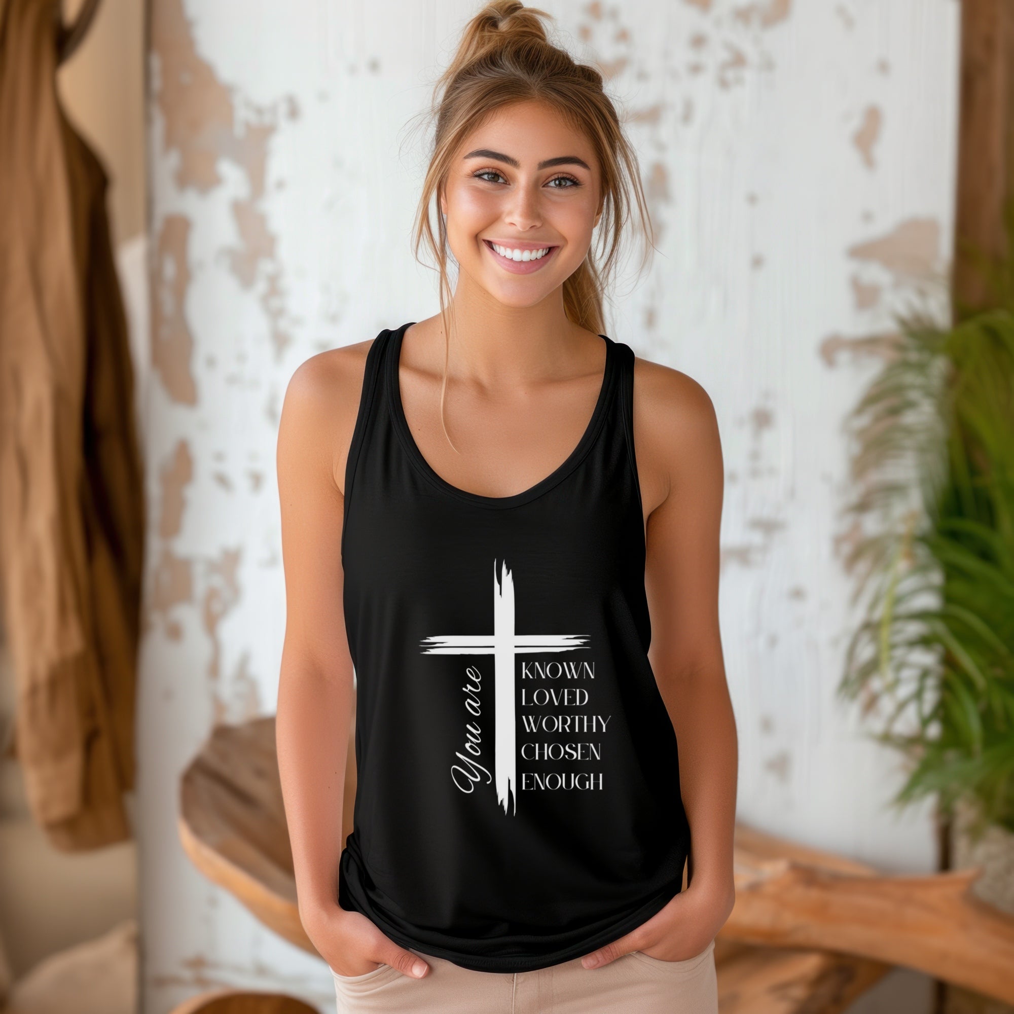 You Are Known, Loved, Worthy, Chosen, Enough – Women’s Flowy Racerback Tank Celebrate your identity in Christ with our You Are Known, Loved, Worthy, Chosen, Enough Flowy Racerback Tank Top. Designed for the woman who walks boldly in faith, this tank serves as a wearable reminder of the truth spoken over you in Scripture. With a flattering, flowy fit and soft, lightweight fabric, this racerback tank is ideal for warm days, layering, or casual wear. Whether you're heading to church, running errands, at a workout class, or relaxing with friends, this tank top delivers both comfort and encouragement with every wear. ✨ Product Features: Flowy, feminine fit with racerback design Lightweight and breathable fabric Faith-based affirmation printed on front Inspires confidence, identity, and strength in Christ. Perfect For: Gifts for Christian women, friends, or youth leaders Birthdays, Easter, Mother’s Day, or encouragement Bible studies, retreats, or daily wear. Biblical Inspiration: "You are precious in My sight, and honored, and I love you." – Isaiah 43:4 "You are a chosen people, a royal priesthood..." – 1 Peter 2:9 You are more than enough—because of the One who calls you His own.